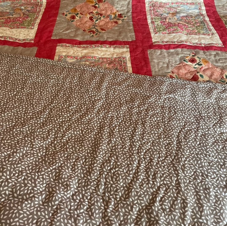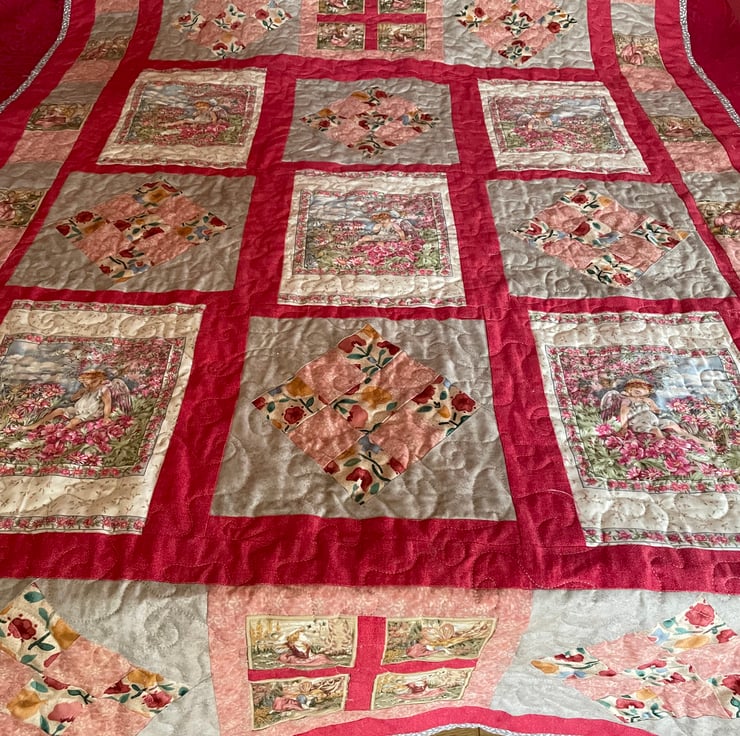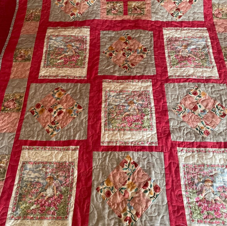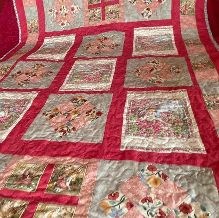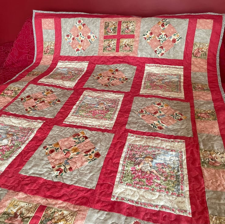 This quilt features a soft, dreamy palette of blush pink and warm beige, creating a gentle and cozy feel. Delicate fairy panels are scattered throughout the design, each one framed by subtle patterns that highlight the artwork without overpowering it. The fairies add a touch of magic and whimsy, while the calm colours keep the quilt elegant and soothing—perfect for a peaceful bedroom or a comforting decorative throw.