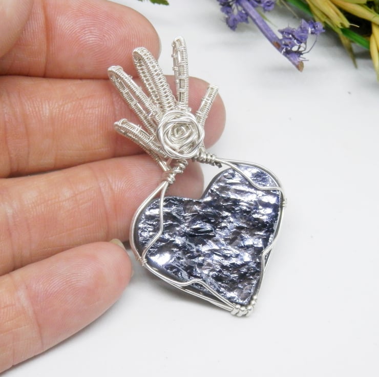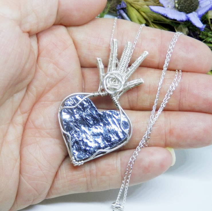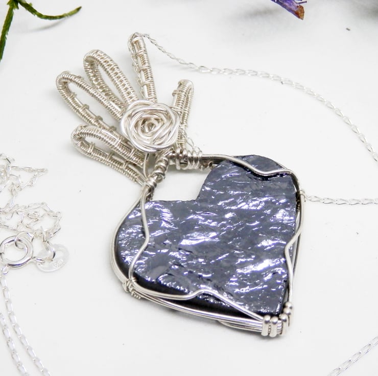 This is a beautiful wire wrapped Necklace, made using 925 Sterling Silver wire that has been wrapped lovingly around a heart shaped Silicon cabochon. I have added a fancy bail and a swirly flower as accent.
