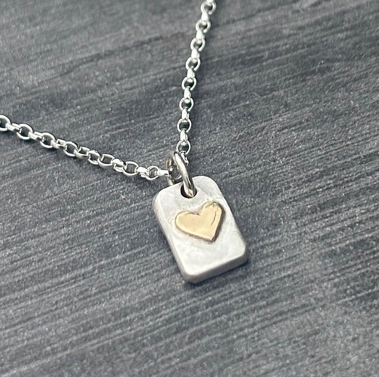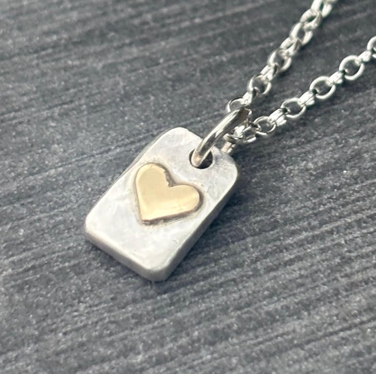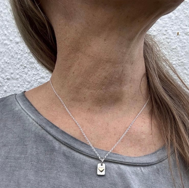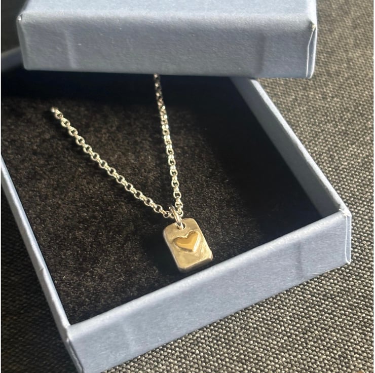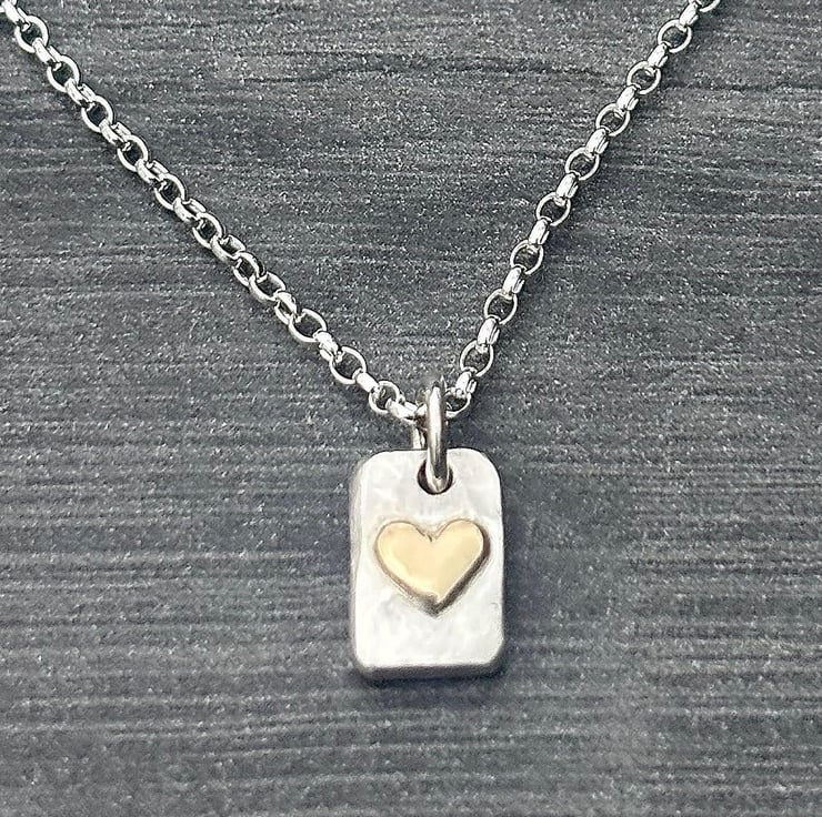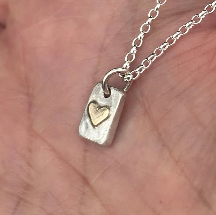 This Sterling Silver and 9ct Gold Heart Pendant is made from solid Sterling Silver and features a solid 9ct yellow gold heart. The silver has been hammered and given a satin finish which contrasts beautifully with the shiny yellow gold. The pendant has a height of approximately: 11mm and hangs on an 18” Sterling Silver chain.