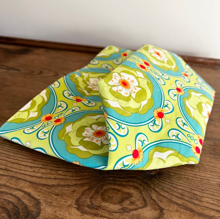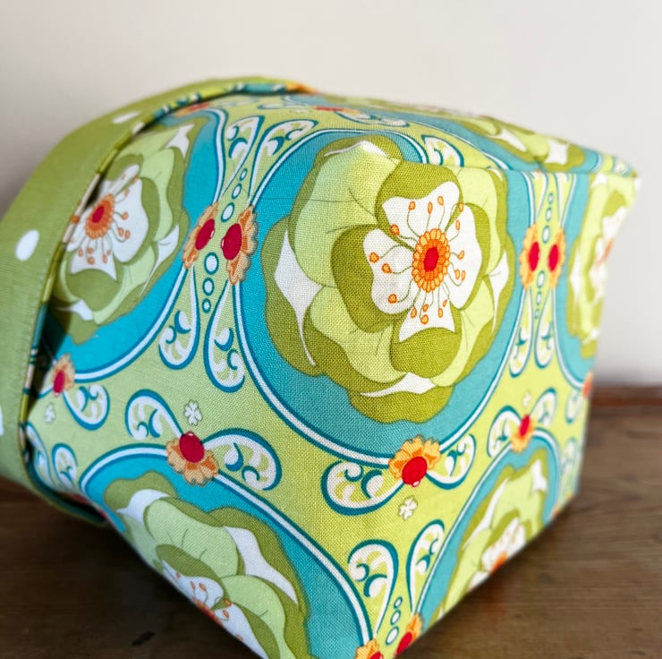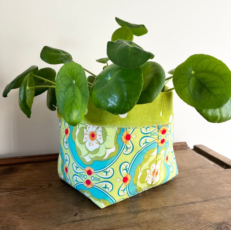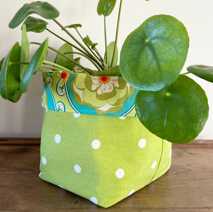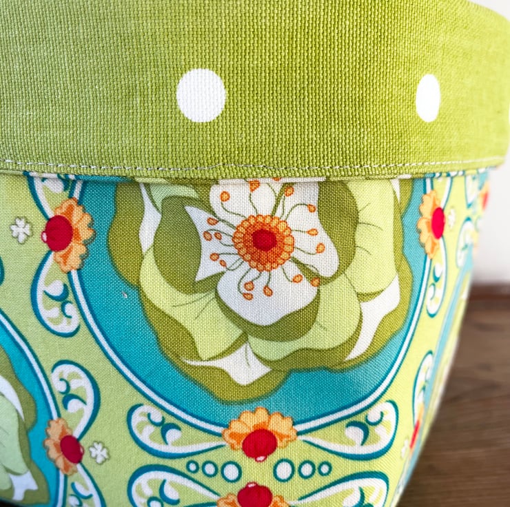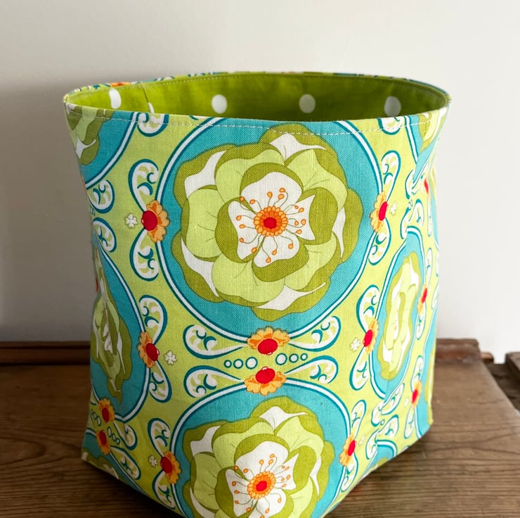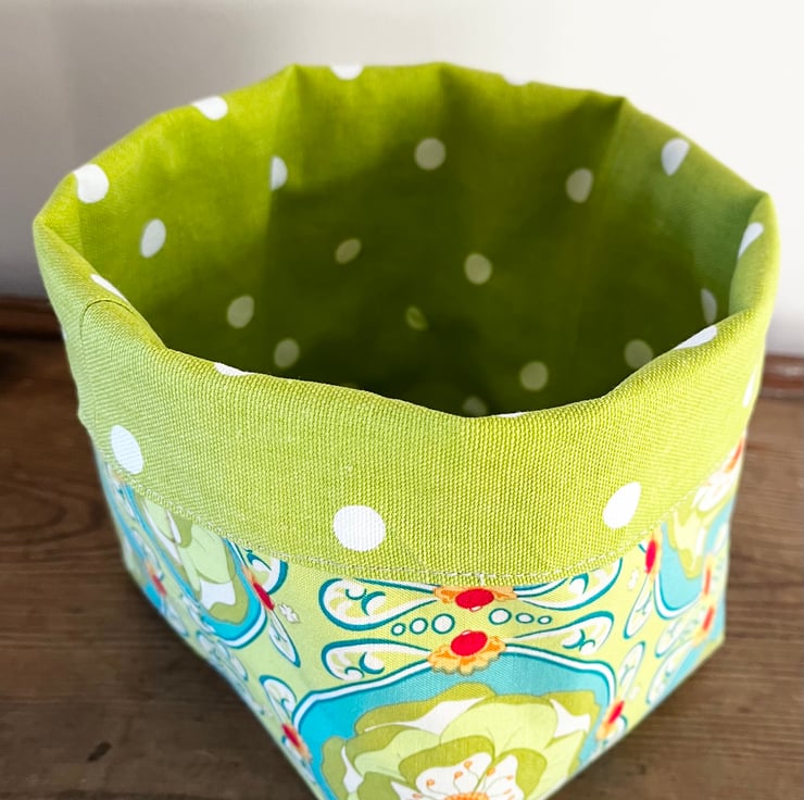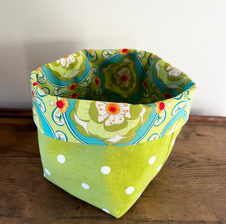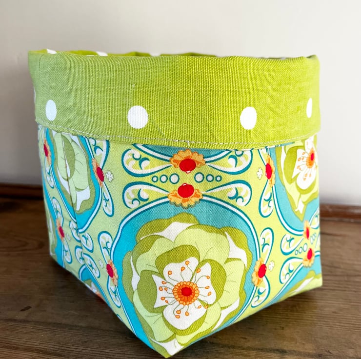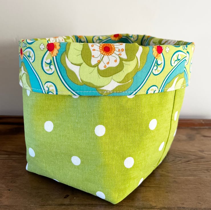 Reversible storage basket made from bright floral cotton in shades of green and spotty green and white cotton. A layer of interfacing between the layers makes it sturdy. Can be used with a turn-down to make the most of the contrasting fabrics.