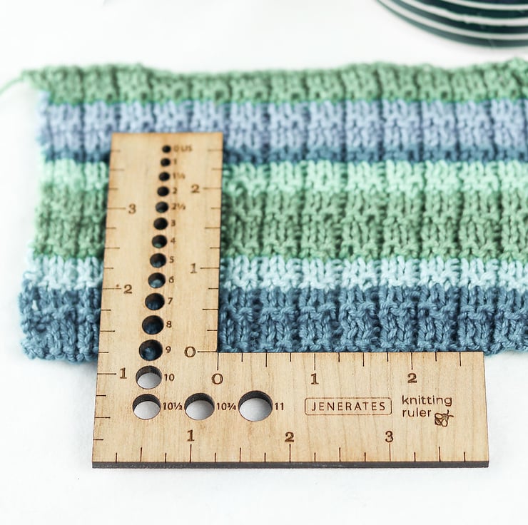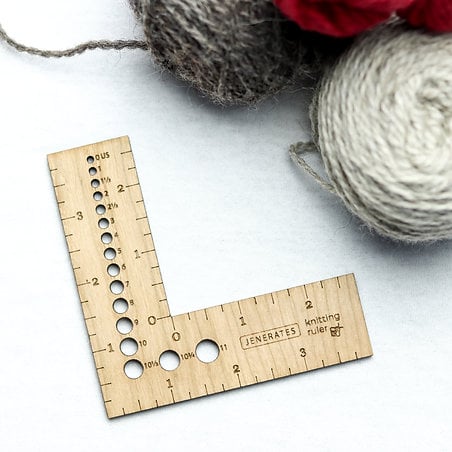 The unique Jenerates Knitting Ruler in inches. The ruler starts at zero at both the inside and outside corners, which means you can use it whichever way best lets you see your work. Plus there's a needle gauge from 2mm to 8mm (0 to 11 on the imperial version) and the ruler fits a standard size tension square.