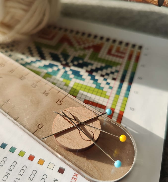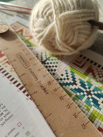 Sandwich the instruction sheet between the front and back of the tracker, and move it up the sheet as you go. The top ruler is made from clear acrylic (recycled of course!) so you can see the line you're on and - here's the game changer - the line you've just completed as well. When you work from a chart you know that the line below is Very Important Information, as a reference to make sure you're working in the right place.