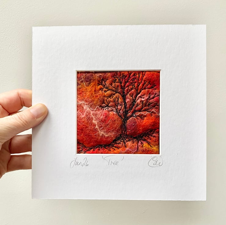 This original Artwork shows a sunrise behind a beautiful shaped tree silhouette. It’s a wet felting with free motion embroidery.