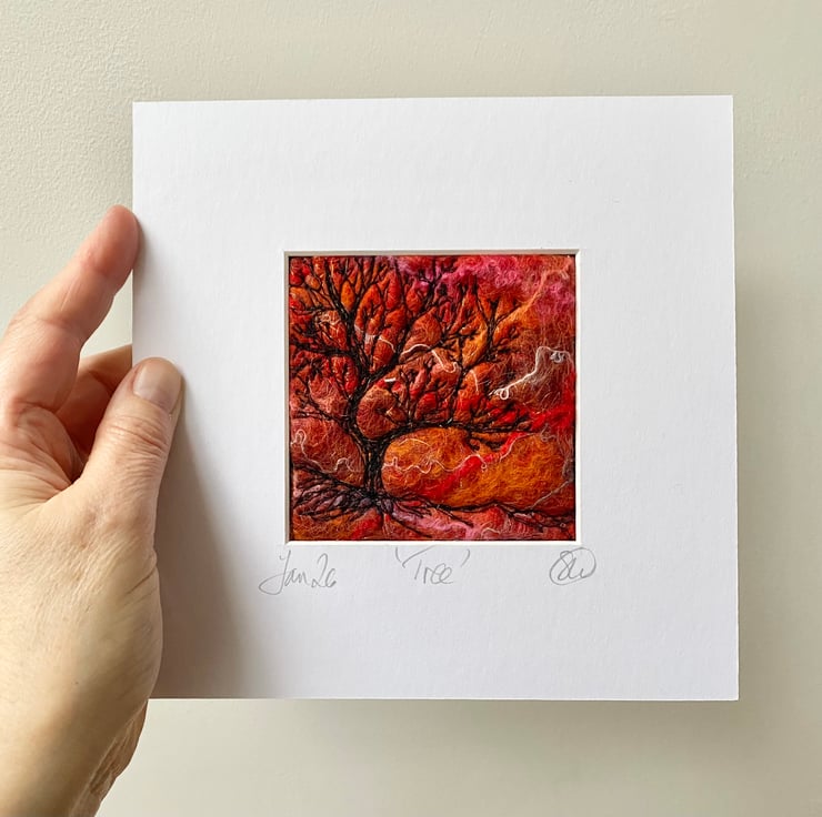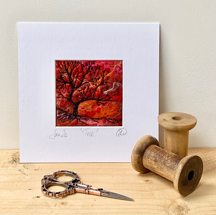 This original Artwork shows a sunrise behind a beautiful shaped tree silhouette. It’s a wet felting with free motion embroidery.