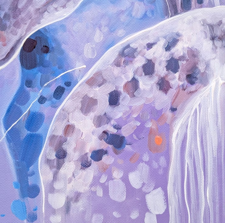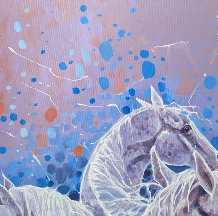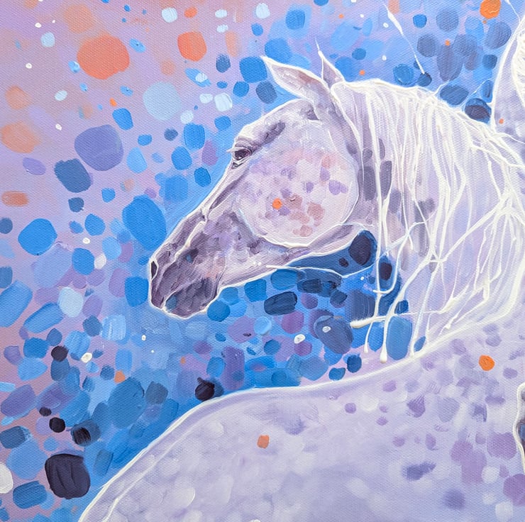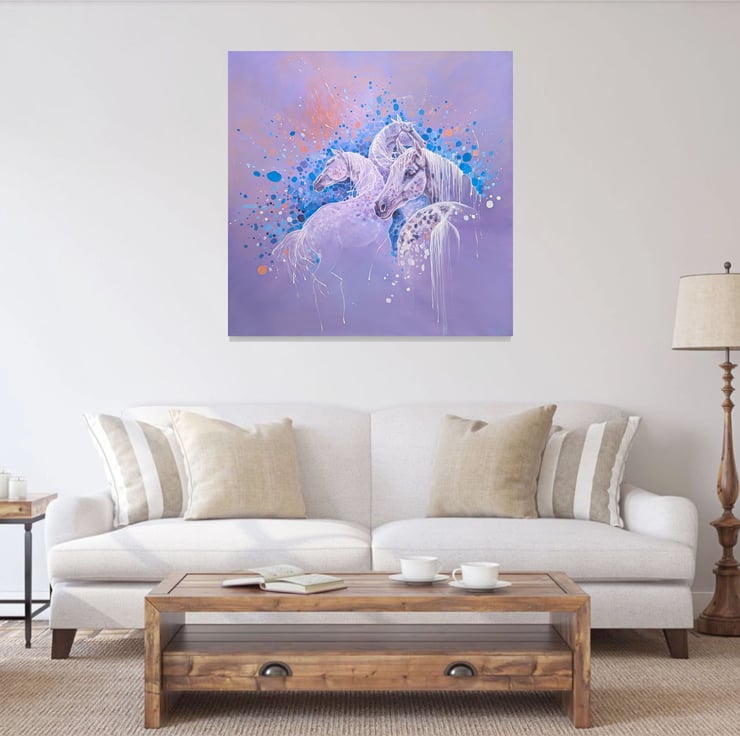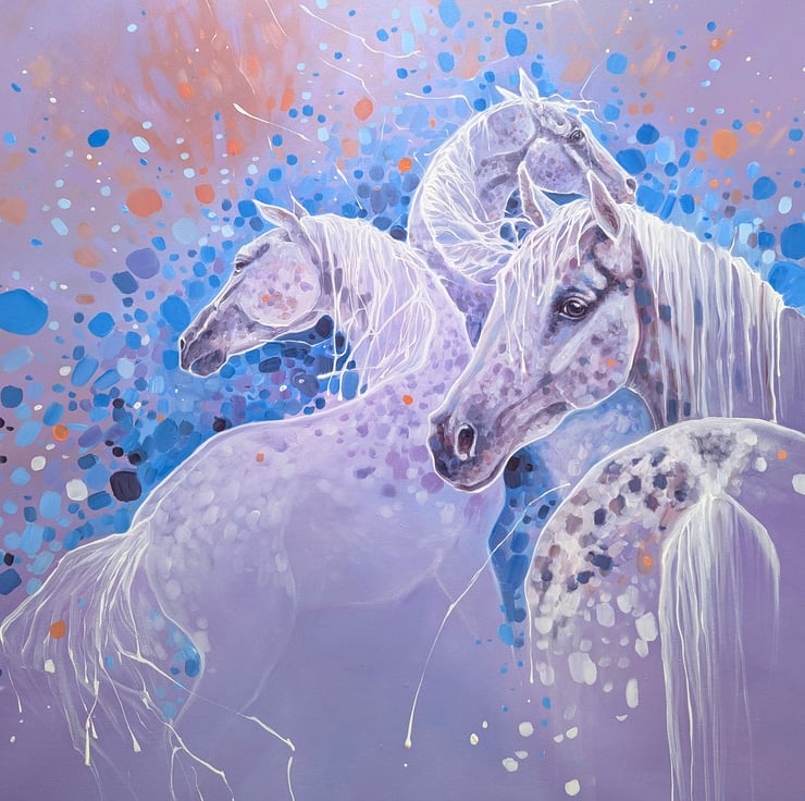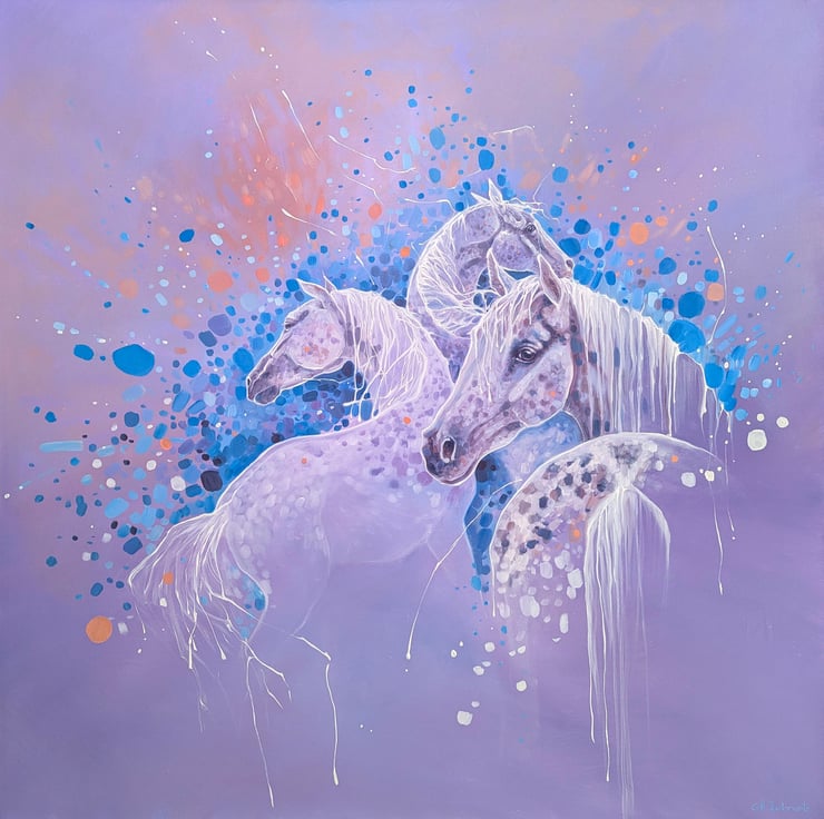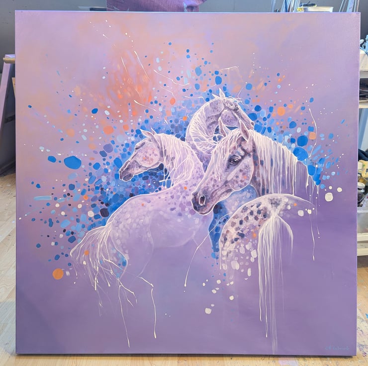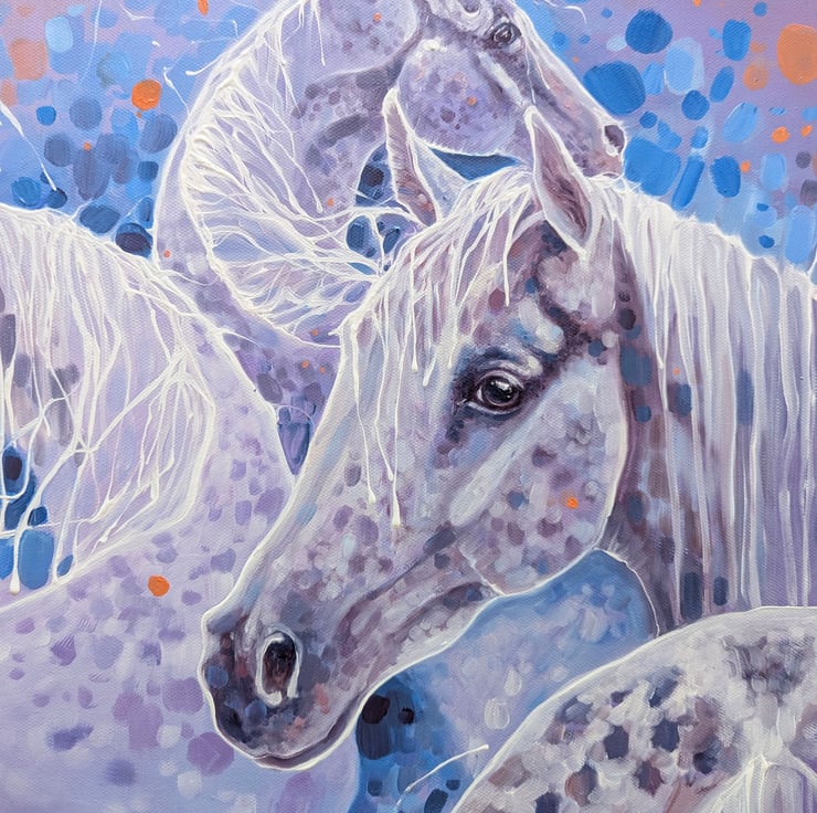 A Symphony of horses is a semi-abstract purple oil painting of three Arabian horses. It is 36x36x1.5 inches. The three pale dappled horses are positioned in the centre of the canvas with one looking questioningly back at the viewer and the other two looking right and left. The background is purple and the horses are pale whites and greys with dots and flashes of orange making interesting contrasts. The inspiration for it was simply a celebration of the beauty of horses and these horses are moving as if part of a dance or to some kind of equine symphony. They are going somewhere and the invitation is to follow… Painted on deep edge canvas, edges purple, ready to hang and comes with certificate of authenticity.