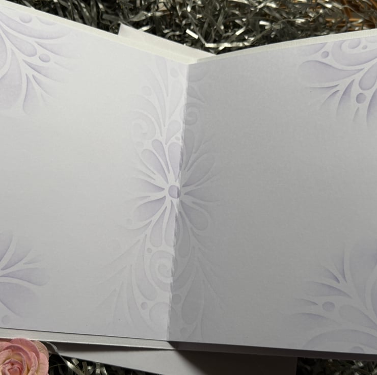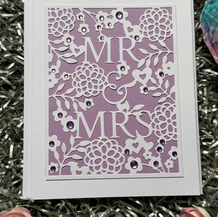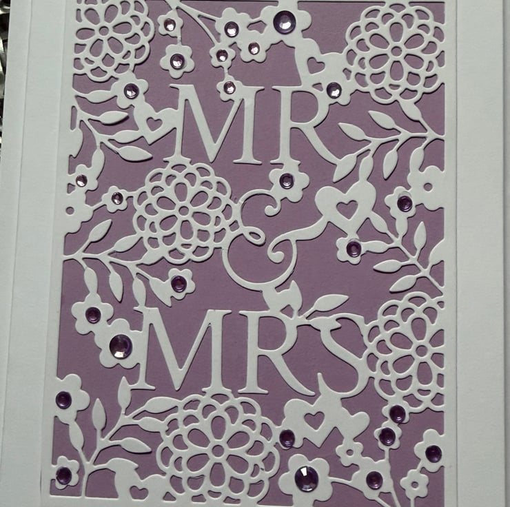 An elegant card utilising a cut out design for the Mr & Mrs and decorated with coordinating lilac gemstones.