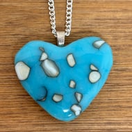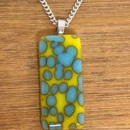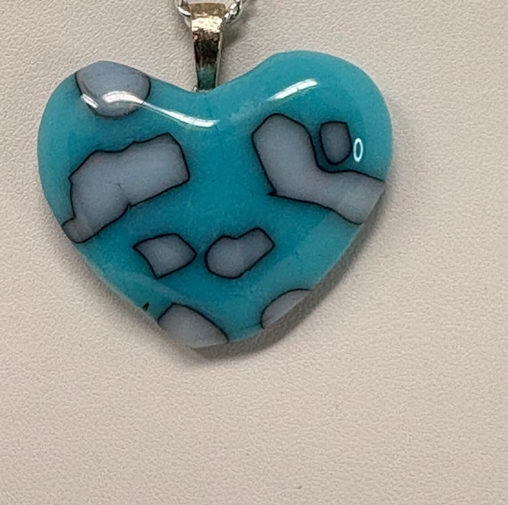 This fused glass pendant is an eye-catching pendant crafted from robin’s-egg blue and soft vanilla Bullseye glass that react together when fired. The gentle blue evokes open skies and serenity, while the creamy vanilla tones add warmth and balance. Kiln-fired for depth and a glossy finish. Crafted by hand at The Glass Shed, it’s been carefully kiln-fired to achieve its striking depth, texture, and luminosity.