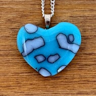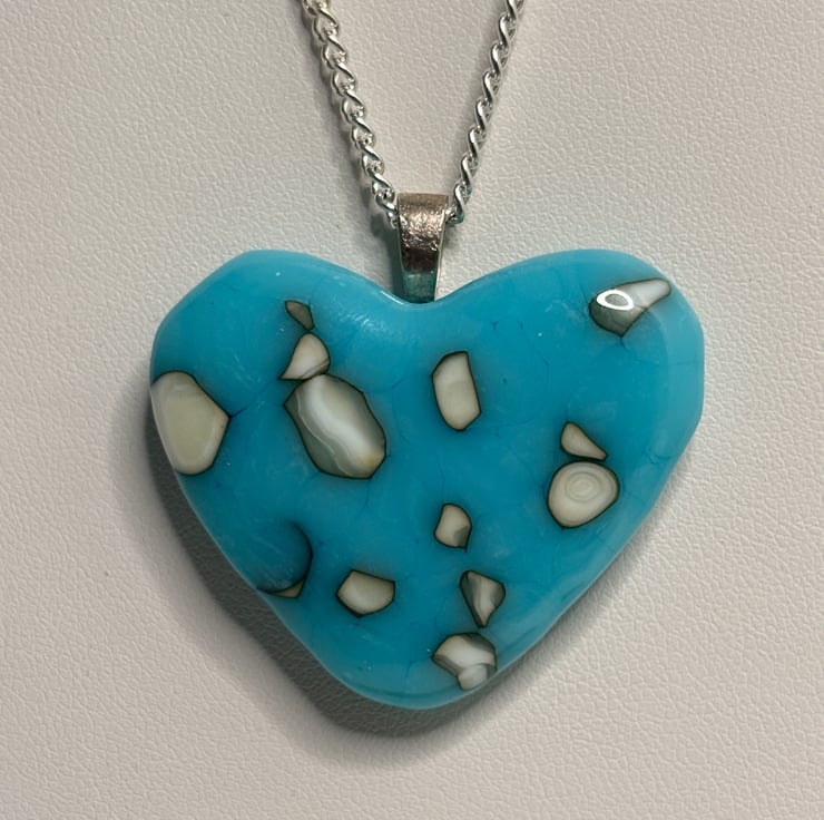 This fused glass pendant is an eye-catching pendant crafted from robin’s-egg blue and soft white Bullseye glass that react together when fired. The gentle blue evokes open skies and serenity, while the creamy vanilla tones add warmth and balance. Kiln-fired for depth and a glossy finish. Crafted by hand at The Glass Shed, it’s been carefully kiln-fired to achieve its striking depth, texture, and luminosity.