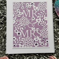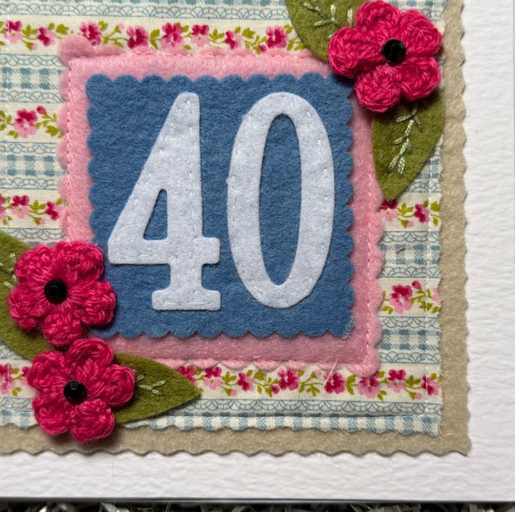 A one off card for someone who will appreciate handmade and unique. I have layered felt and fabric as the base before adding the number 40 in white and finishing off with green felt leaves and crotchet pink flowers.