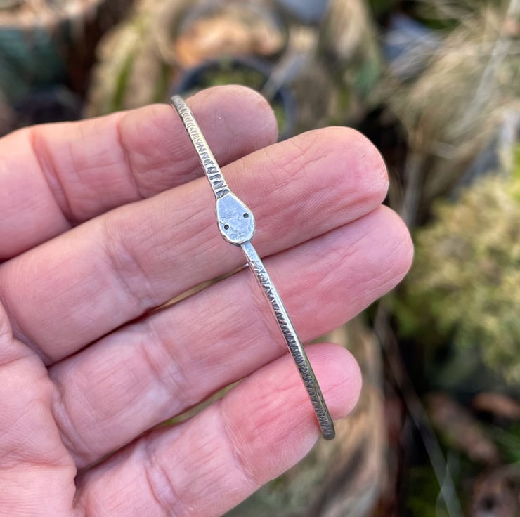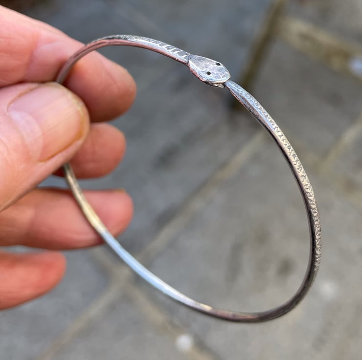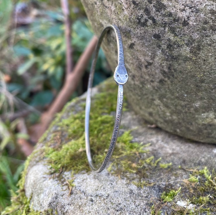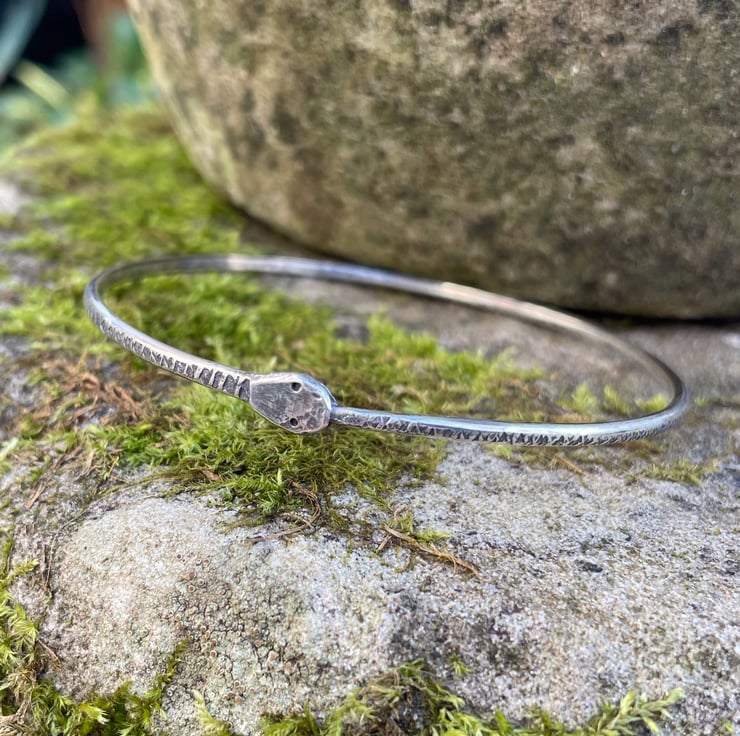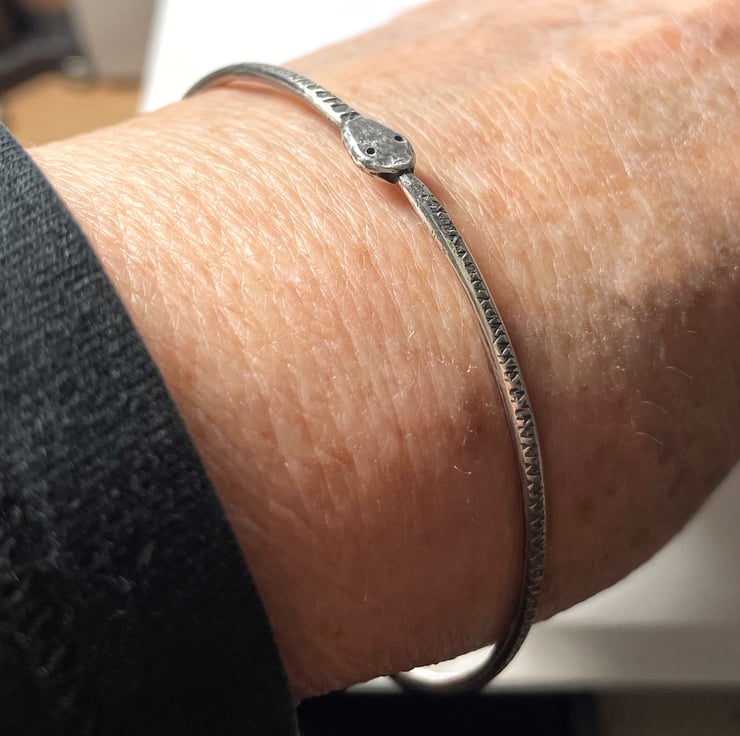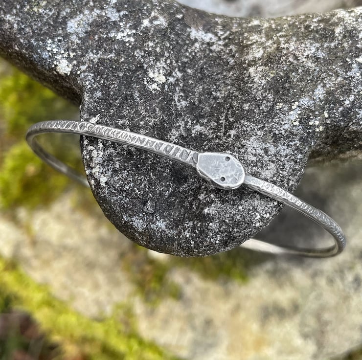This slim 2mm round bangle is textured with a hatched, scale like design, and has a wider head, and a tapered tail that is held in the opened mouth. The silver has been oxidised in the recesses, and rubbed to a subtle shine.