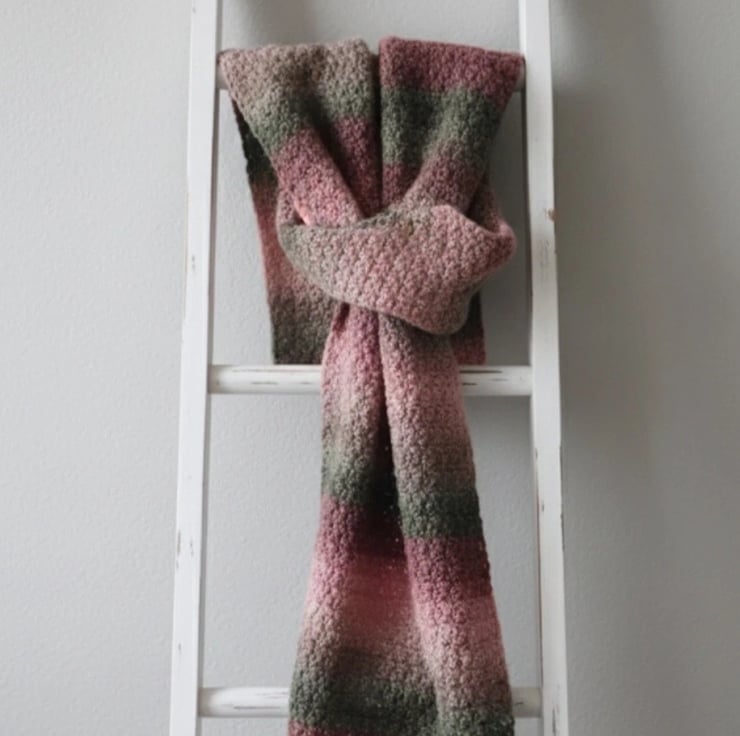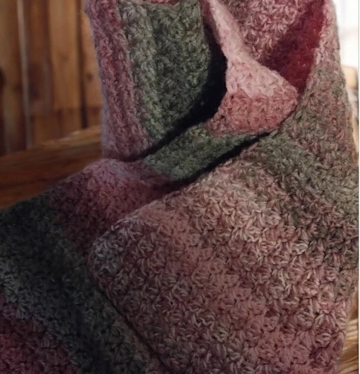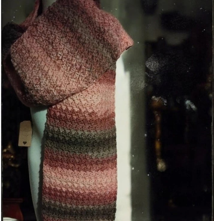 This handmade crochet scarf is a long, warm and cosy accessory perfect for the autumn, winter and spring seasons. Made from wool with a Suzette stitch pattern and multicoloured accents, this rectangular scarf is not only stylish but also functional as a neck warmer.