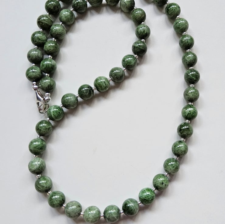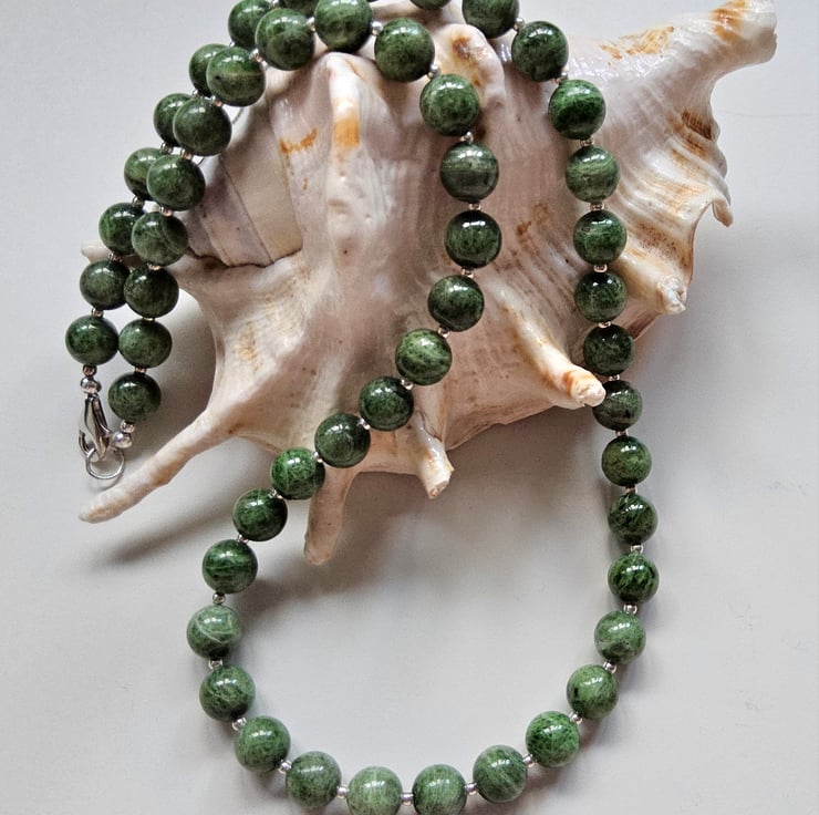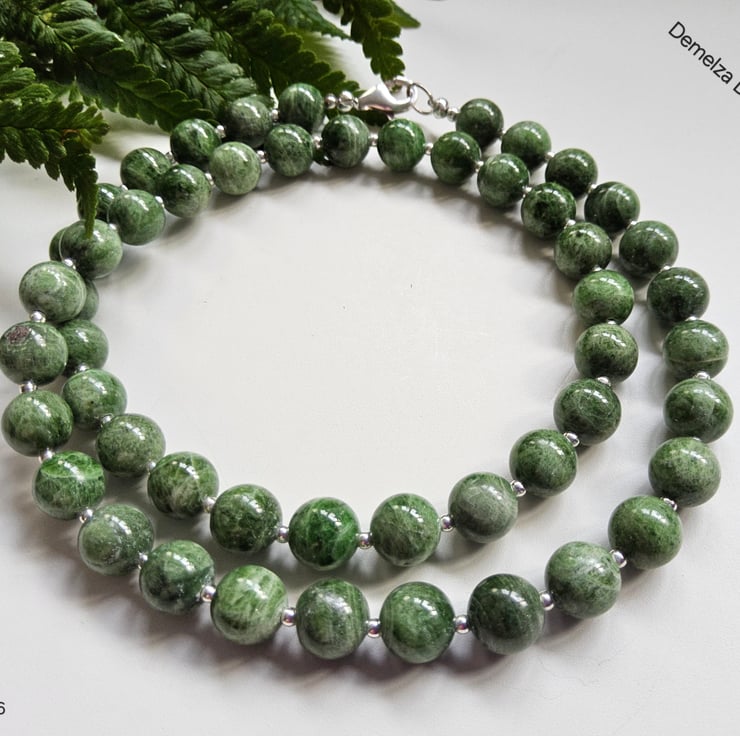 This gorgeous sophisticated necklace is a prime example of quality genuine raw natural untreated Russian Chrome Diopside. It has been designed and hand crafted in Cornwall by Demelza Designs for those seeking something that can be worn on a daily bases with the potential to become an heirloom piece to pass down. The 8mm smooth polished rounds display the deep natural green colours as it comes out of the ground. Between each gemstone is a 2.5 mm sterling silver spacer bead adding sparkle and an opulent finish.