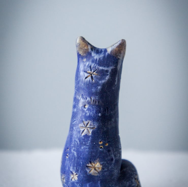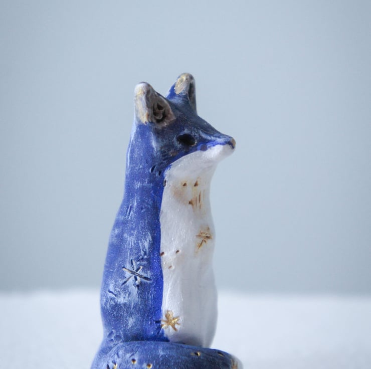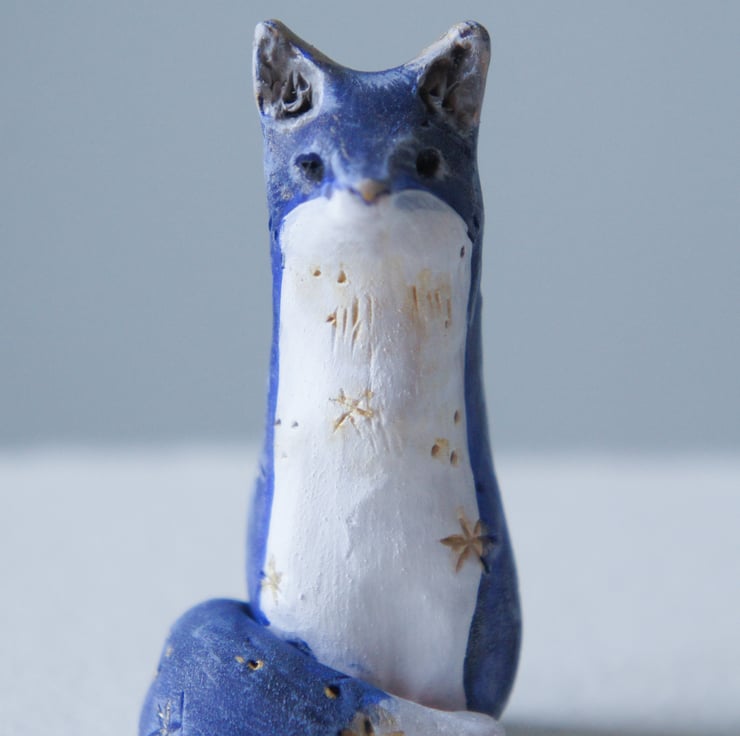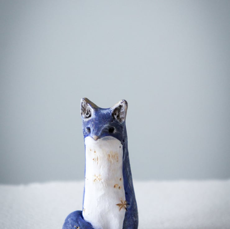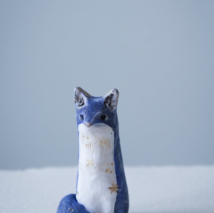 A little hand sculpted and painted blue fox. Star detail. This is the exact one of a kind clay fox you will receive. Sculpted from Sculpey clay This little fox stands at 6cm in height.