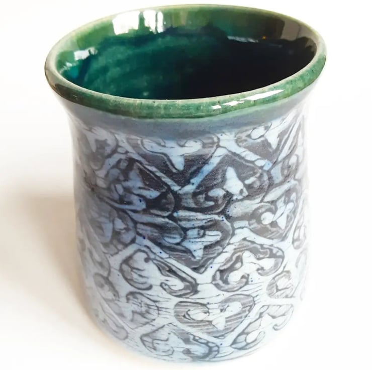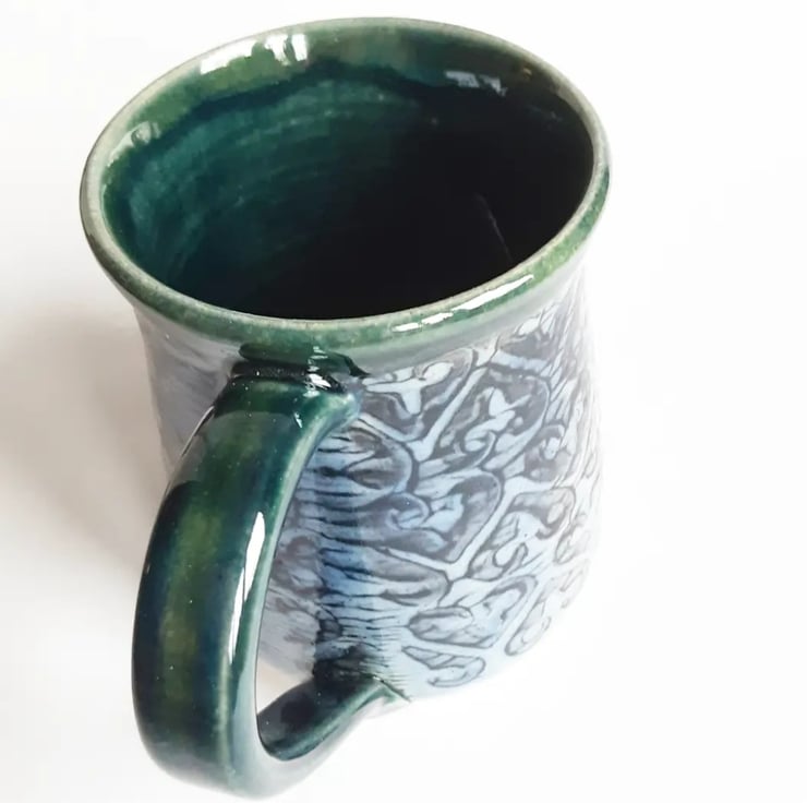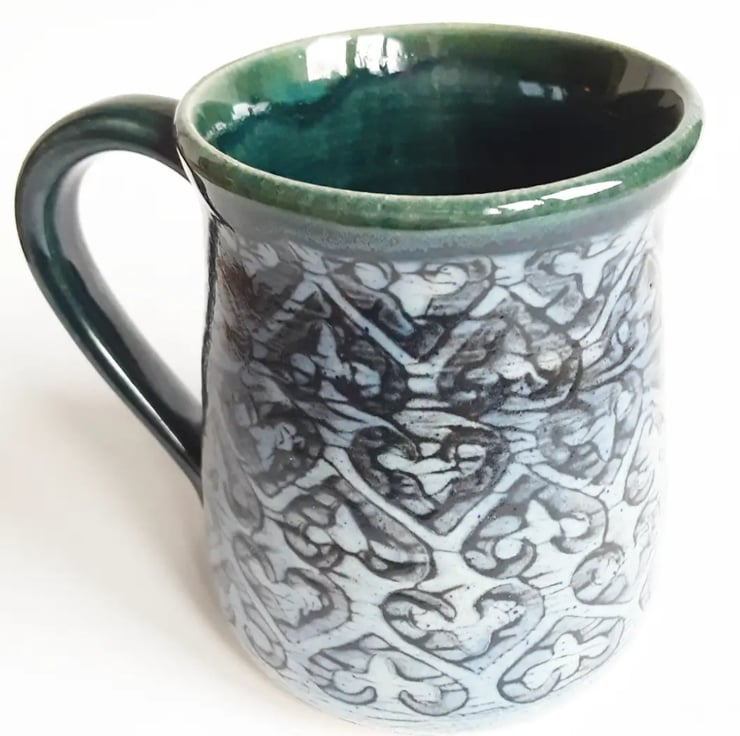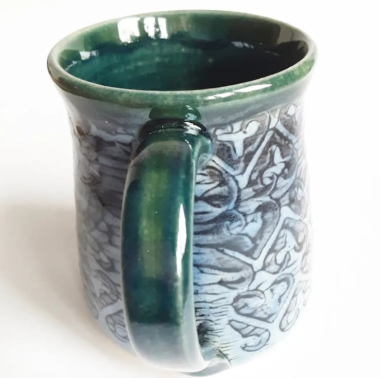 Glazed in blue glazes with a pattern on the mug.