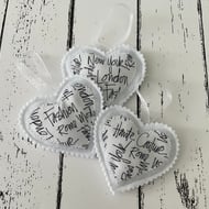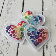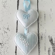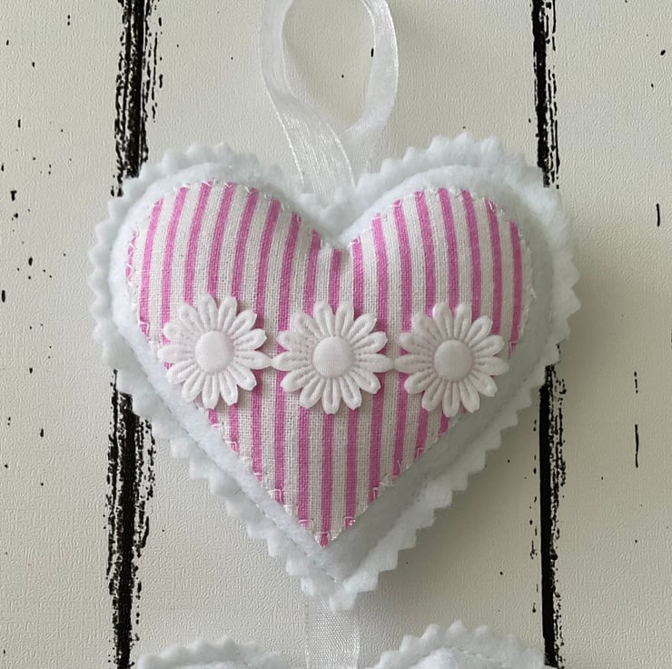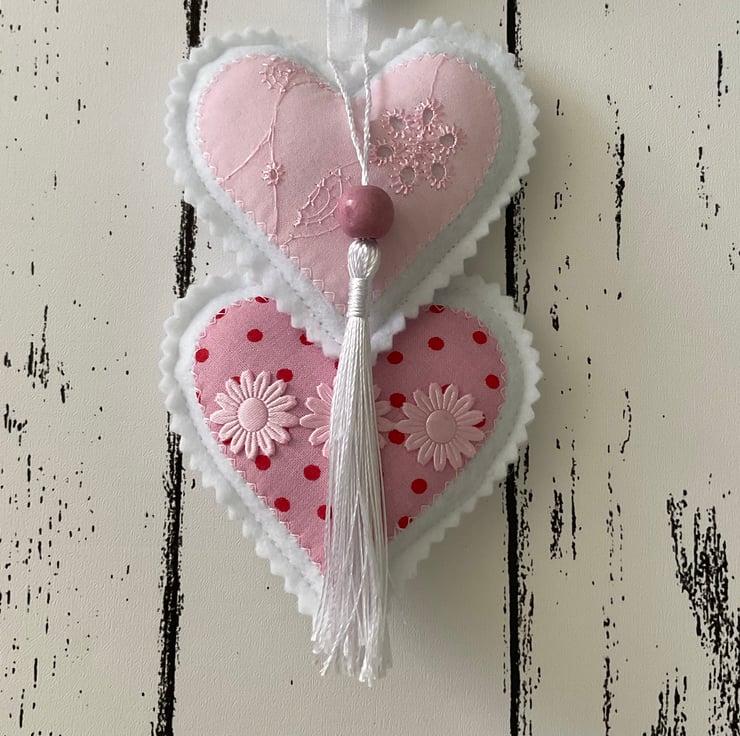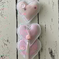 This handmade hanging heart decoration features three softly padded felt and fabric hearts in soft pink and white tones. Each heart has a unique pattern (broderie anglaise, polka dot, and striped), delicately embellished with floral details, finished with a ribbon loop for hanging and a decorative white tassel with bead detail.