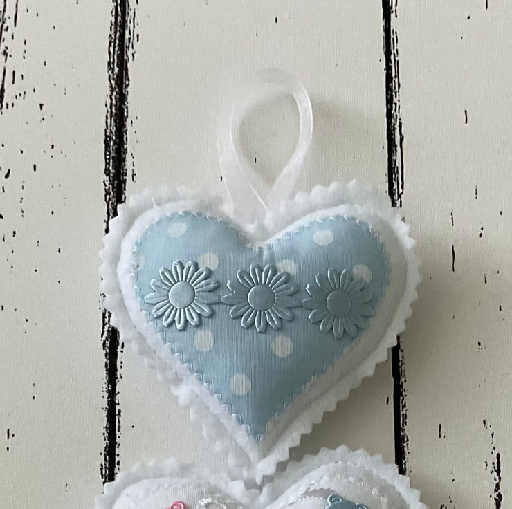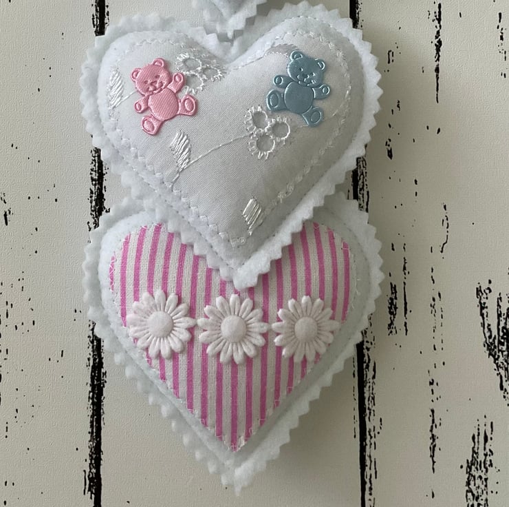 This handmade hanging heart decoration features three softly padded felt and fabric hearts in pink and blue tones. Each heart has a unique pattern (broderie anglaise, polka dot, and striped), delicately embellished with floral details, two teddy bear motifs and finished with a ribbon loop for hanging.