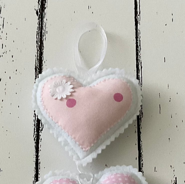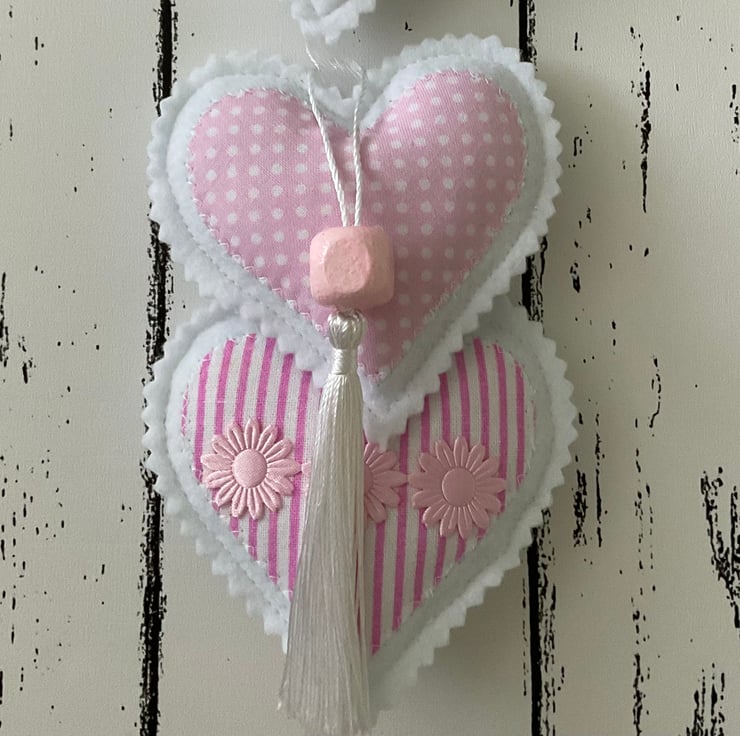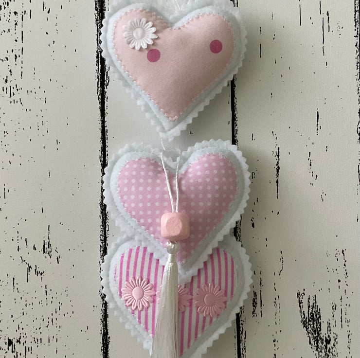 This handmade hanging heart decoration features three softly padded felt and fabric hearts in soft pink and white tones. Each heart has a unique pattern (polka dot, and striped), delicately embellished with floral details, finished with a ribbon loop for hanging and a decorative white tassel with bead detail.