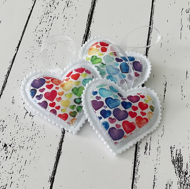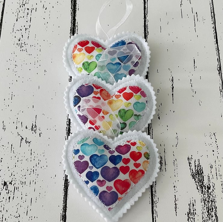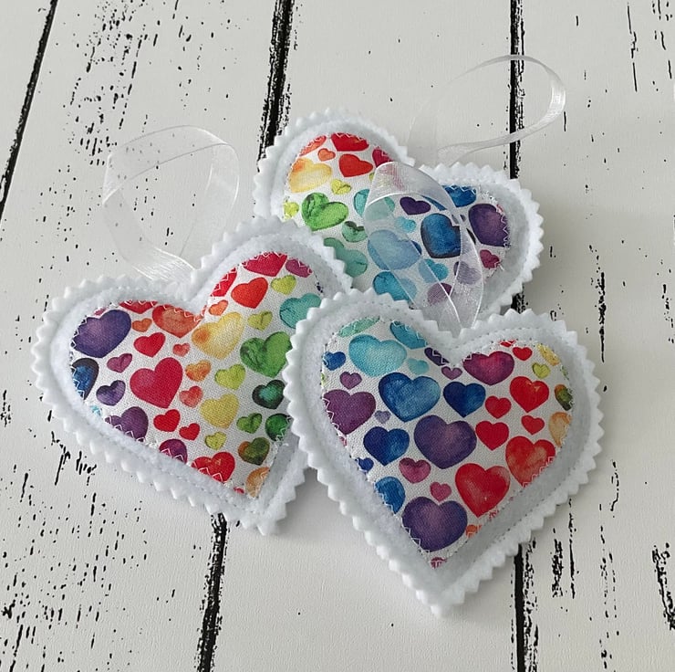 A set of 3 handmade hanging heart decorations made with felt and a colourful rainbow heart fabric, filled with beautifully scented French dried lavender and finished with a loop for hanging.