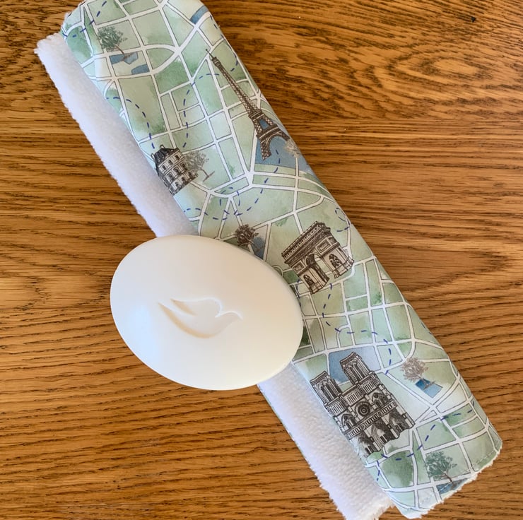 This lovely face flannel is made using Liberty Rue de Paris B (Green) Tana Lawn and is backed with supersoft cotton and bamboo fleece.