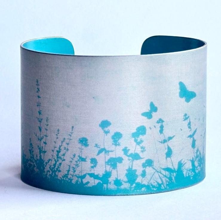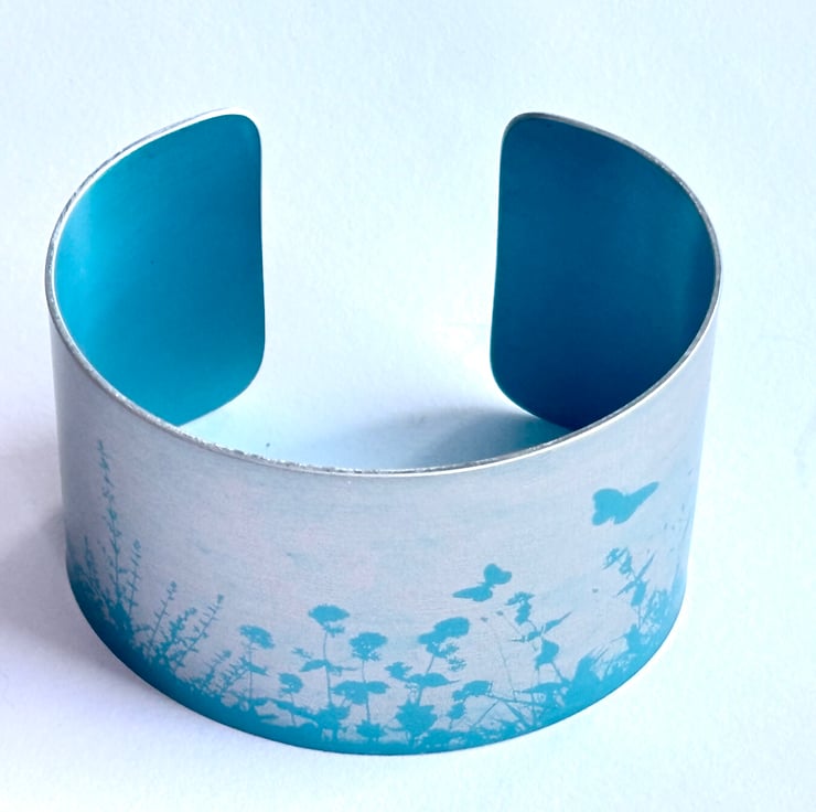 A striking bracelet/cuff made from anodised aluminium with a pattern designed digitally by me. I made the drawing into a resist and applied it to the metal. I then dye the aluminium, seal it and remove the resist which leaves the pattern showing in the original colour of the metal. The cuff is then made using traditional metalworking techniques.
