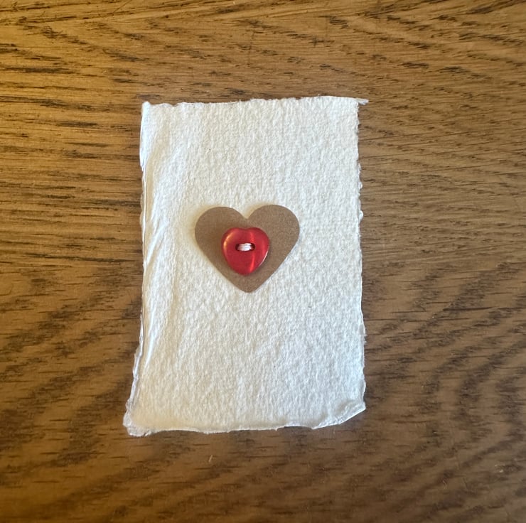 A hand made card featuring a heart design made of card with a heart shaped button as decoration