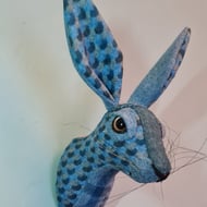 A lifesize faux hare which I have handmade and covered in hand stitched minty teal oloured Abraham Moon wool. The head is backed with felt and has a metal hanger to hang it on the wall. It is lightweight.