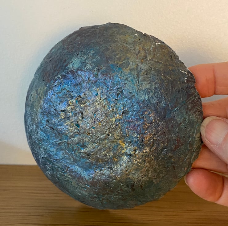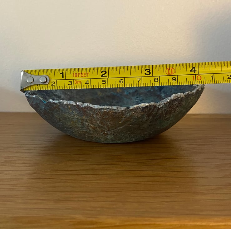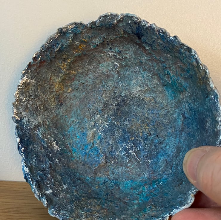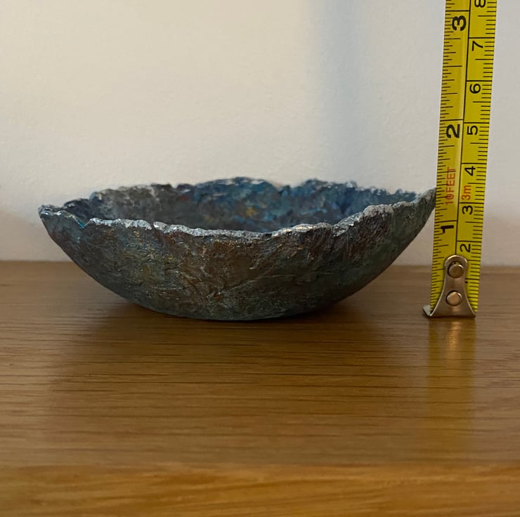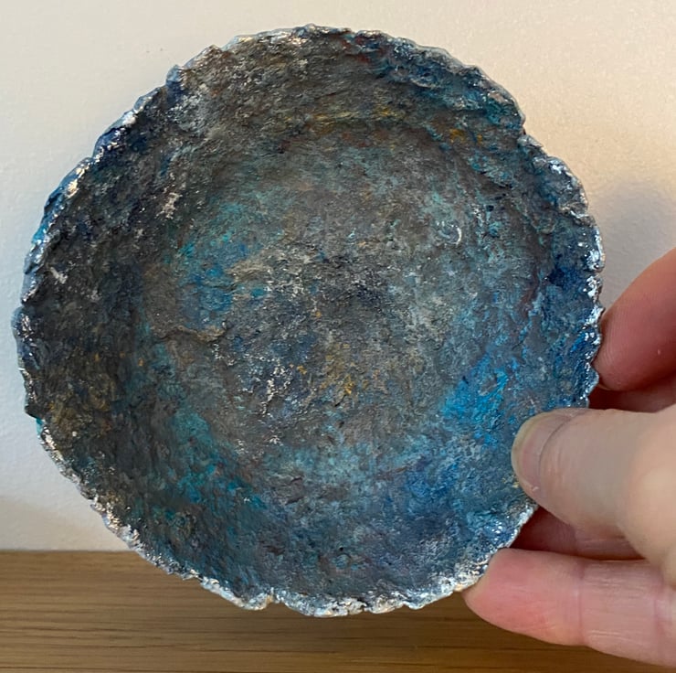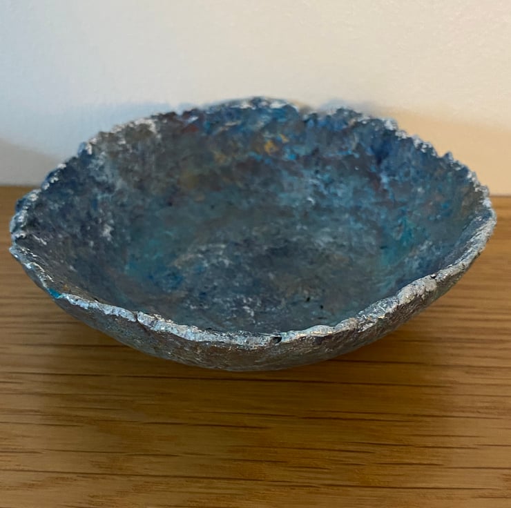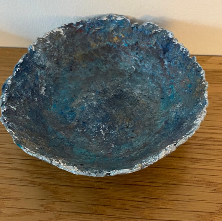 Blue faux stone dish made from recycled paper mache. Painted with layers for gorgeous rich colours to highlight the rustic texture and finished off with a little bit of gilding foil on the rim.