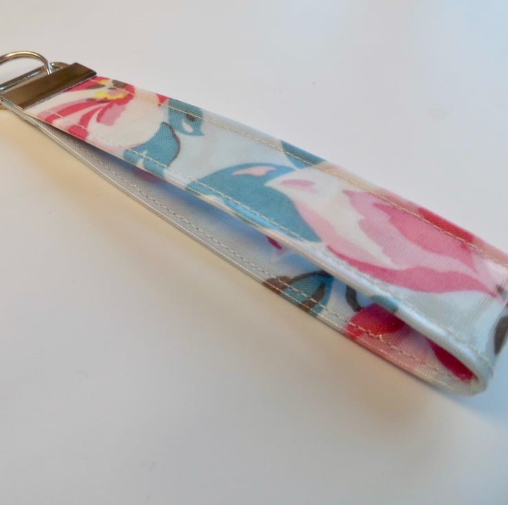 It is topstitched along the edges with ivory thread. It has a silver tone fixing with a split ring at the end. The strap measures approx 5 inches when laying down flat (so 10 inches all the way round) and is about 1 inch wide.