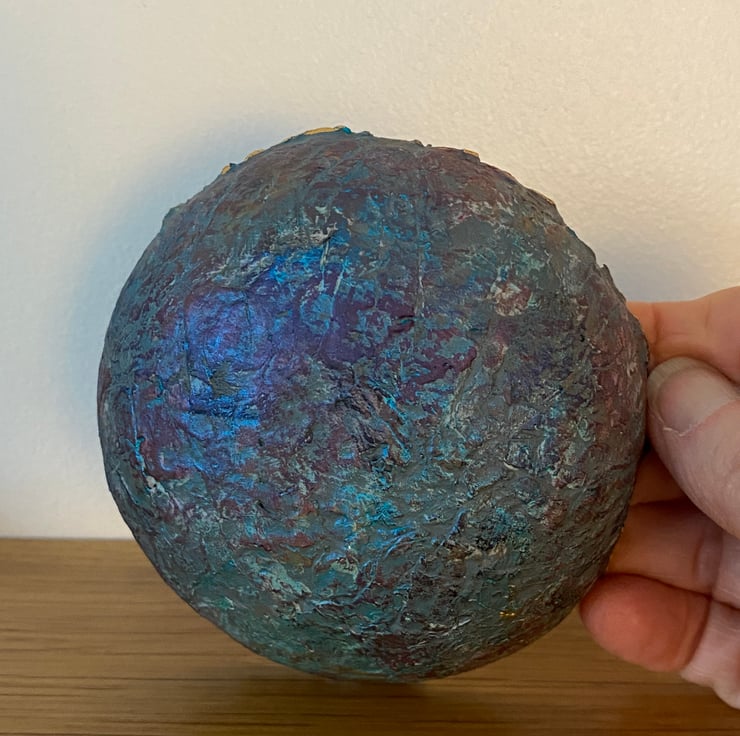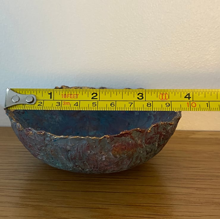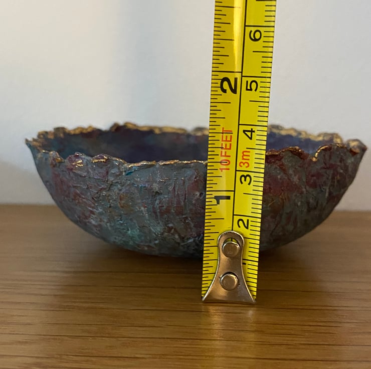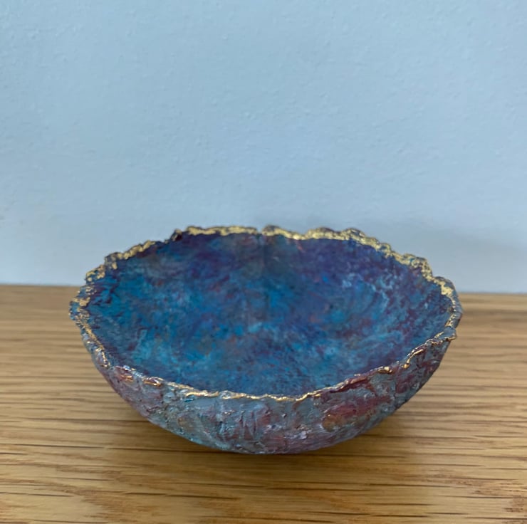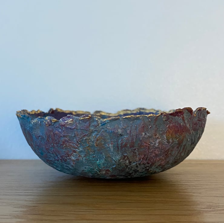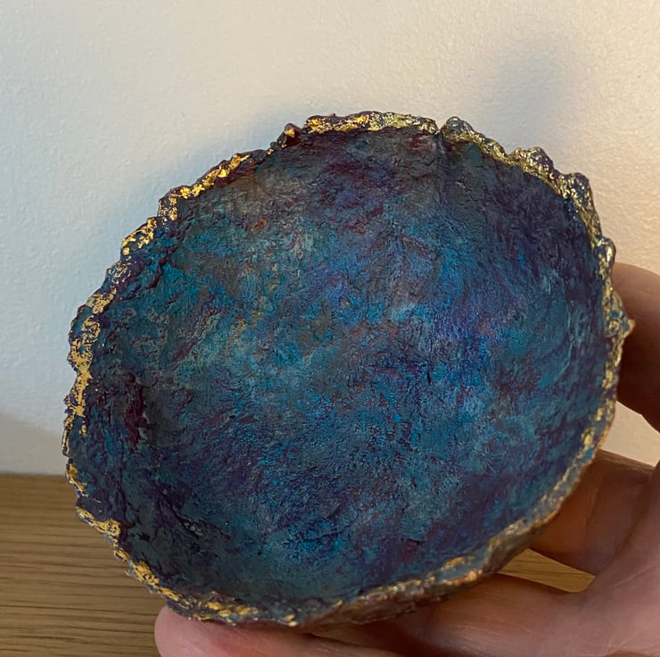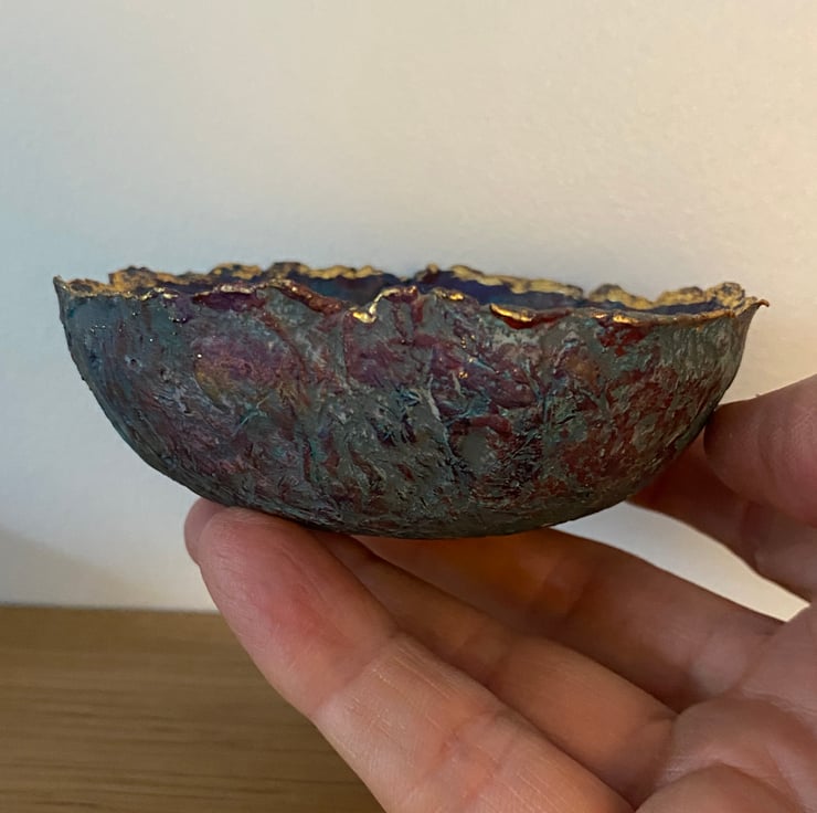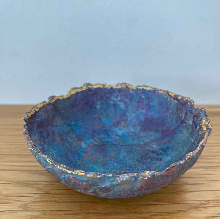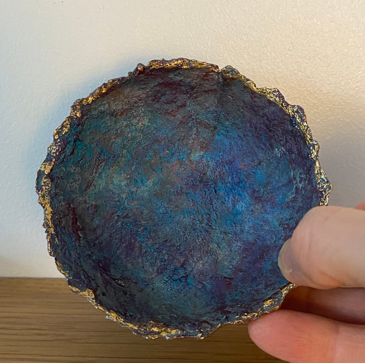 Made from recycled paper and painted with layers of gorgeous rich colour and metallic effects. I used a tried and tested paper clay recipe to make this little bowl. I’ve been using this technique for many years.