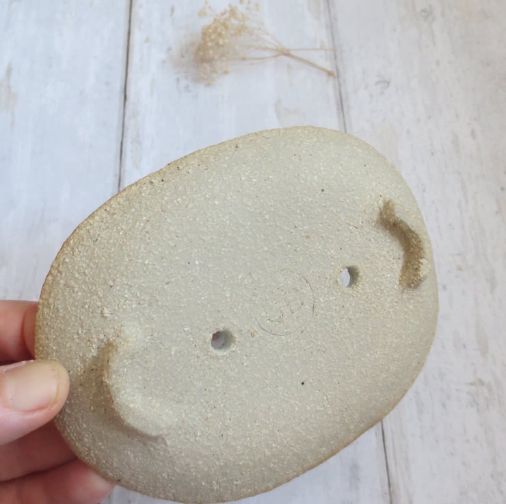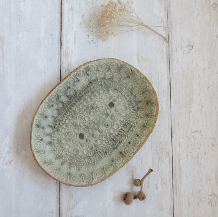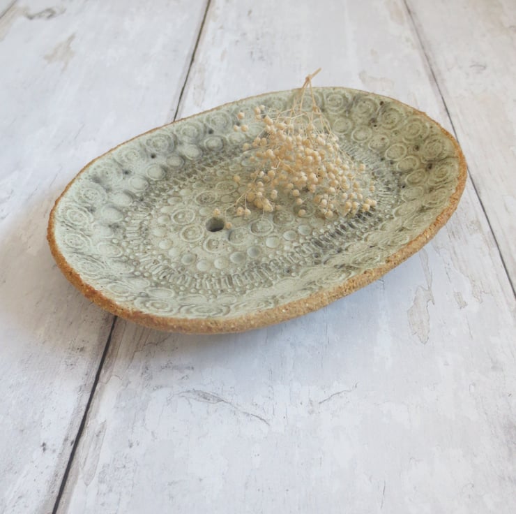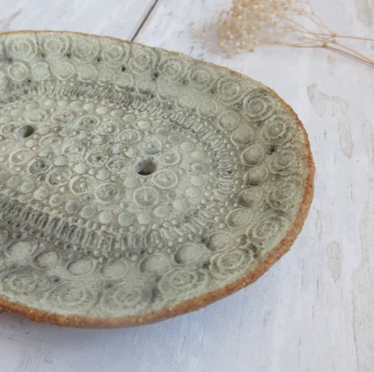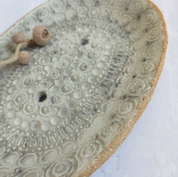 Simple, beautiful oval soap dish hand built from grogged buff-coloured clay that has been impressed with different markings for added interest and texture. The base has two holes and is raised by two feet to assist with drainage.