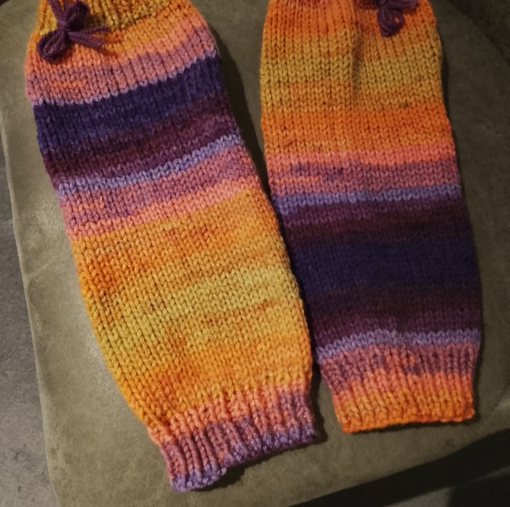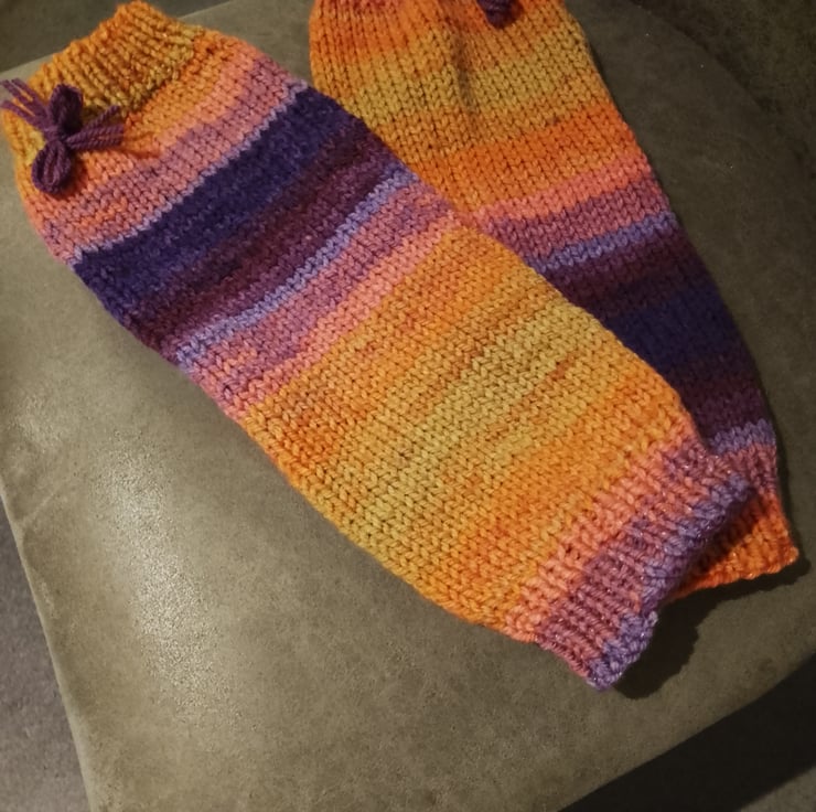 Hand knitted leg warmers in variegated colours to keep ankles thru to calf muscles warm indoors and outdoors. Wear them under trousers, maxi skirts, slouchy style or just be retro and wear them at fitness classes!!!