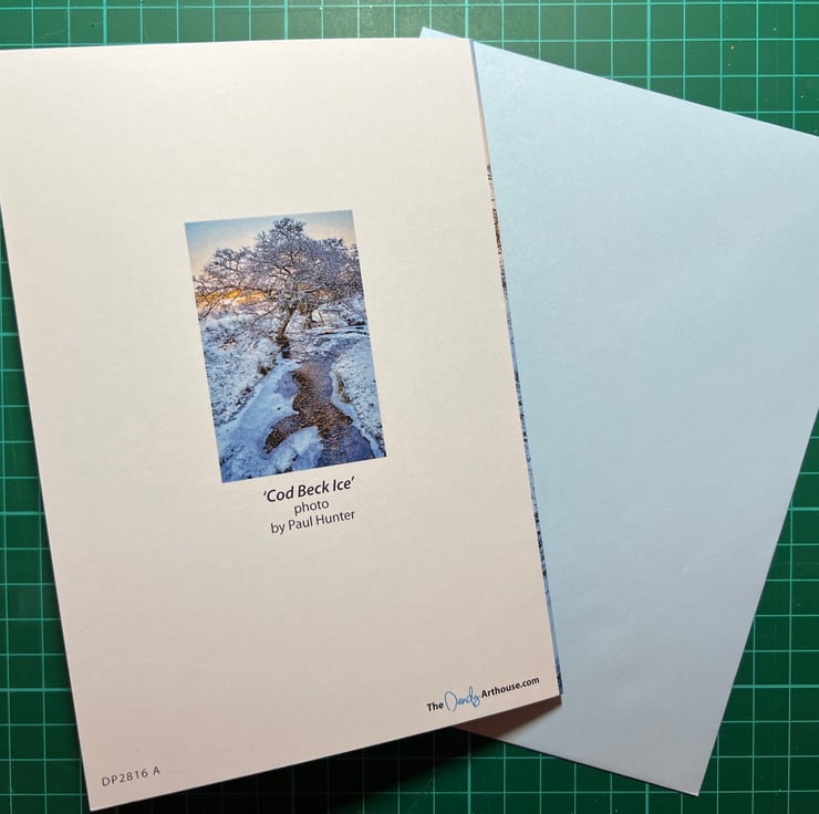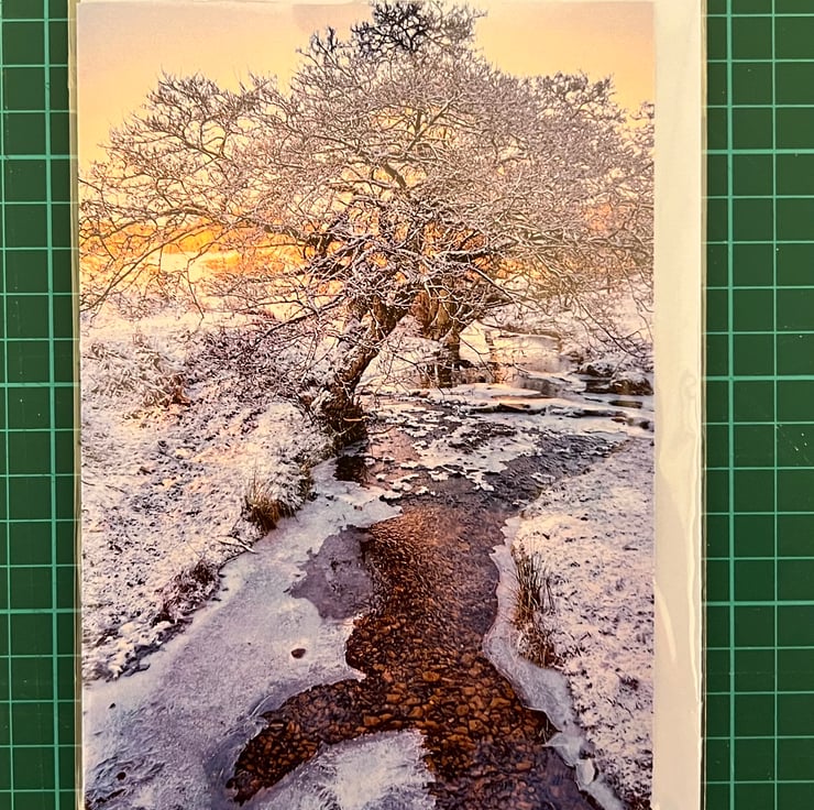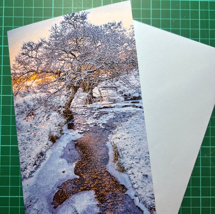 This greetings card is a wintery scene of a winding country beck in Osmotherley, North Yorkshire. It lies between Sheep Wash and Cod Beck reservoir which has a rich history, being part of the route travelled by the drovers from north to south.
