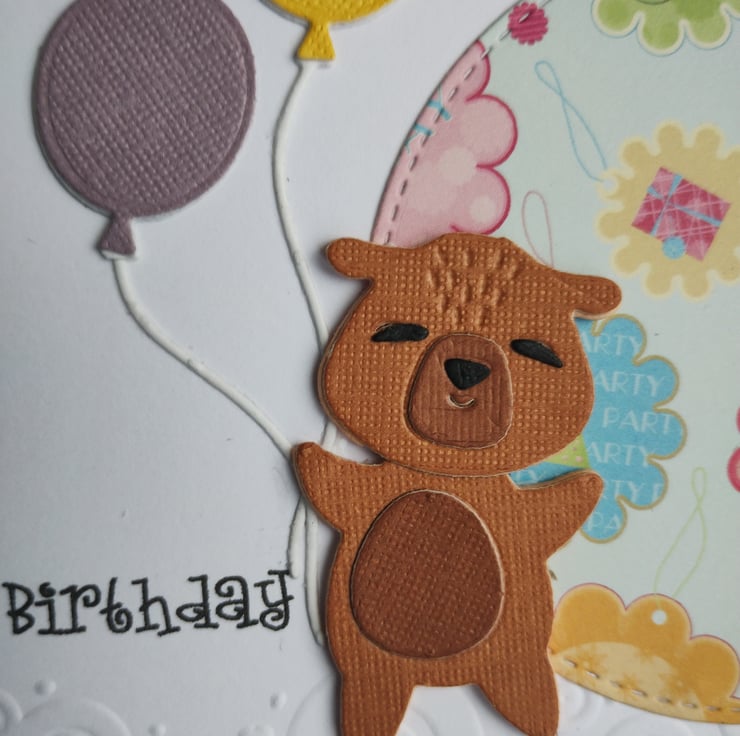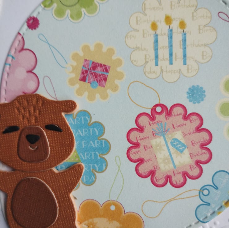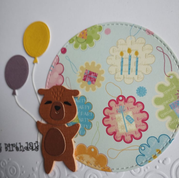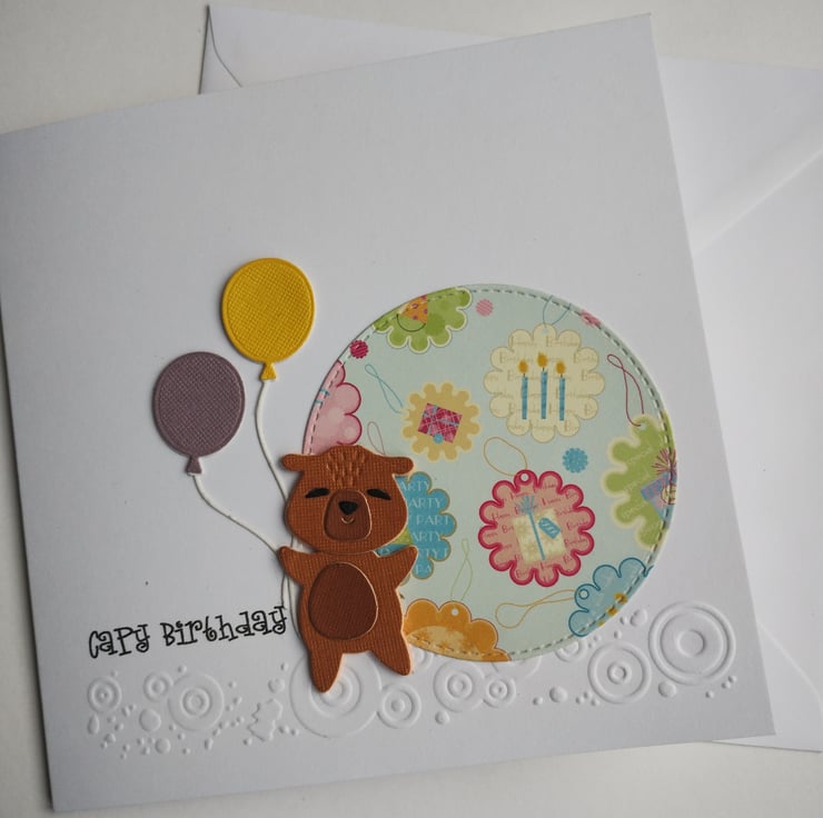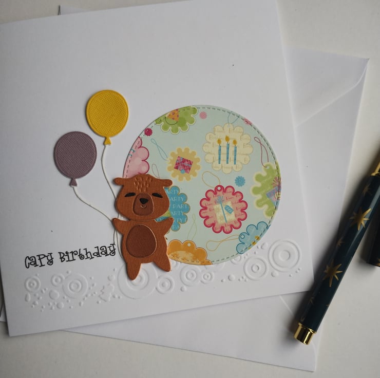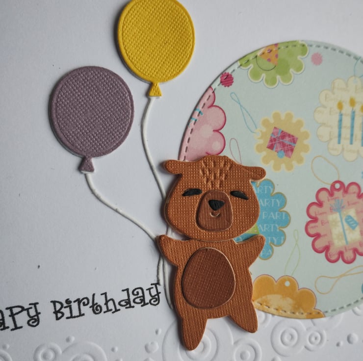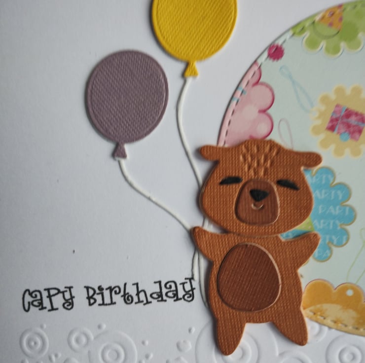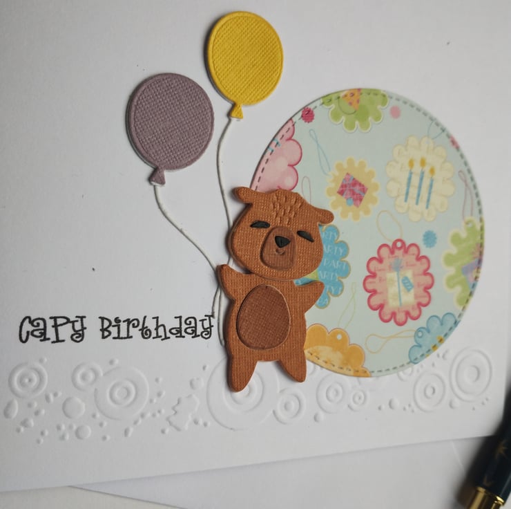 This sweet and simple birthday card features a cute capybara holding a purple balloon and a yellow balloon. I've cut the capy from textured cardstock and layered on foam for extra depth. I've added a circle of sweet birthday patterned paper featuring gifts and candles. I've embossed a strip of circles along the bottom for a little added texture.