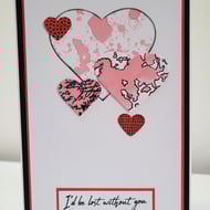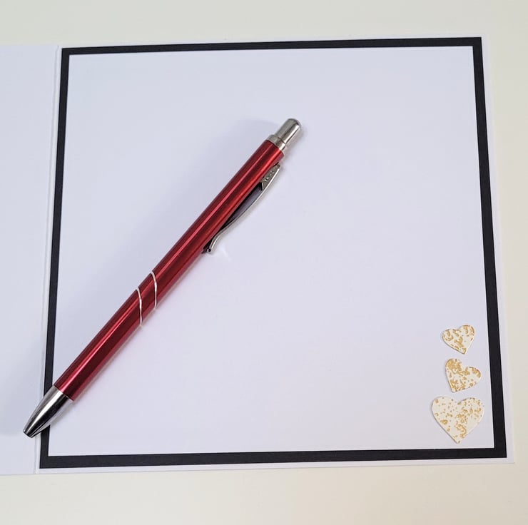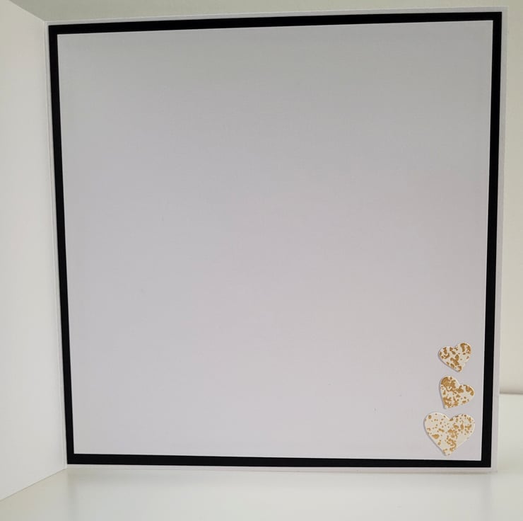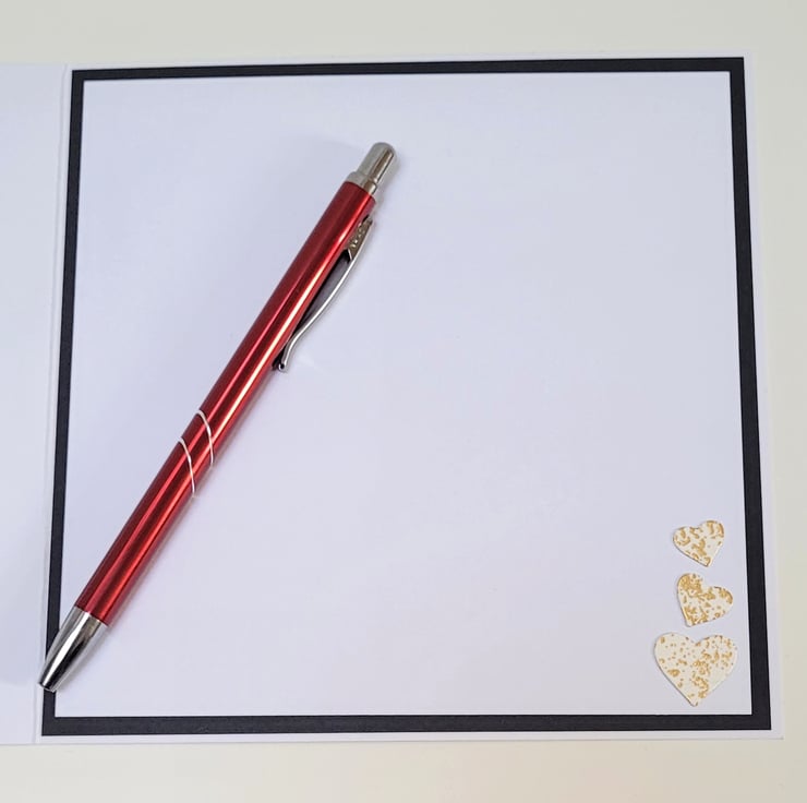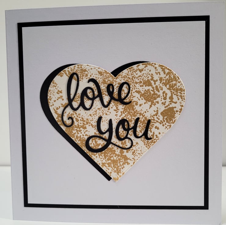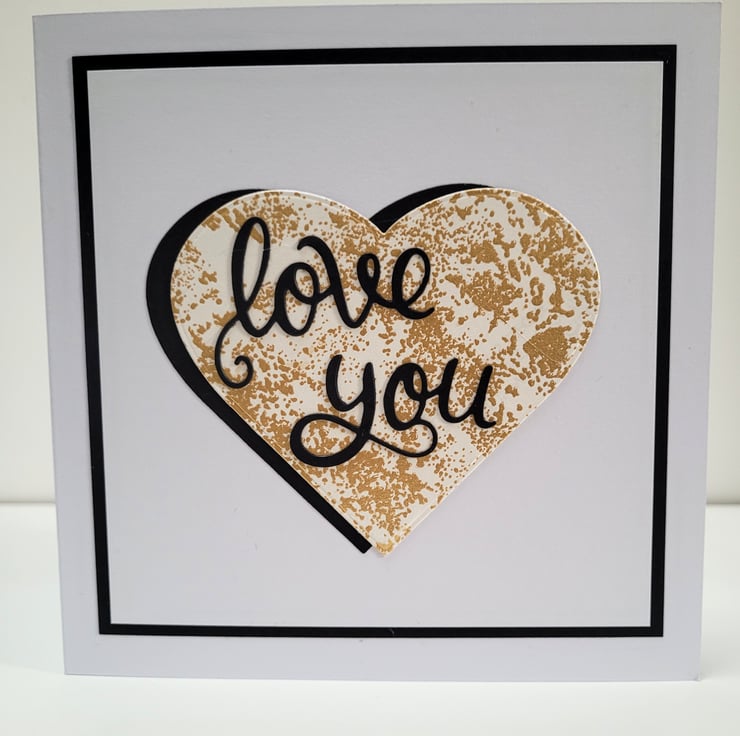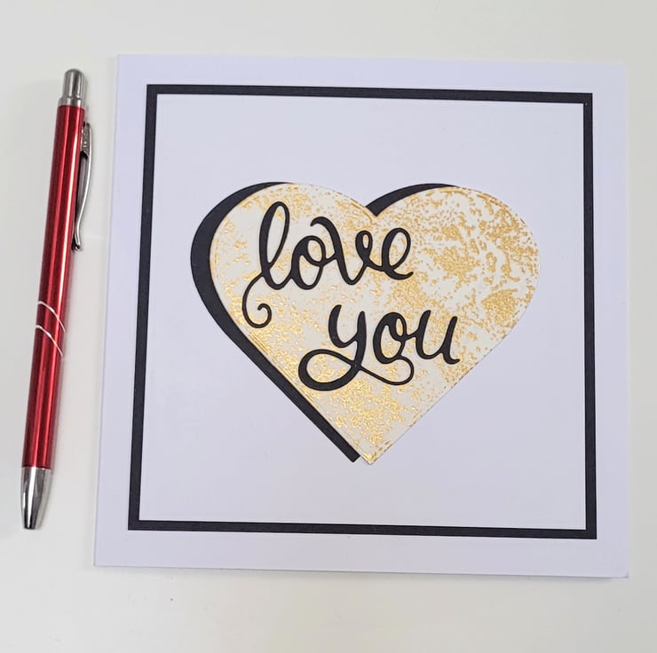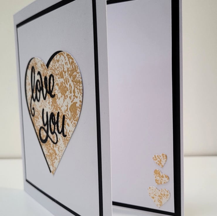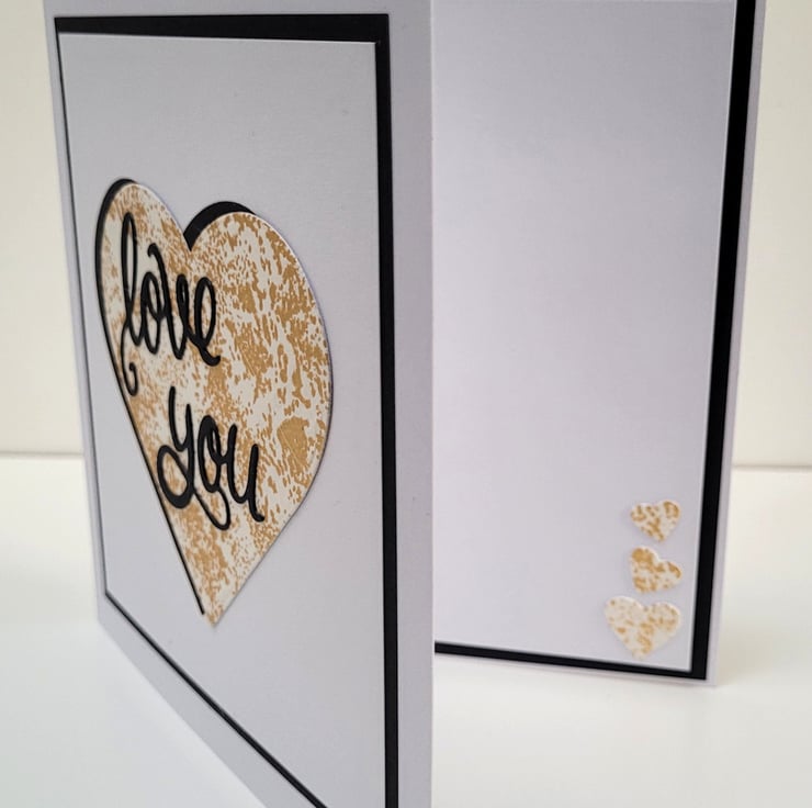 The bold 'Love You' sentiment on the front makes this a great Valentines Day card or Anniversary Card, and the inside of the card has been finished off with coordinating gold hearts, but is otherwise blank for your own personal message.
