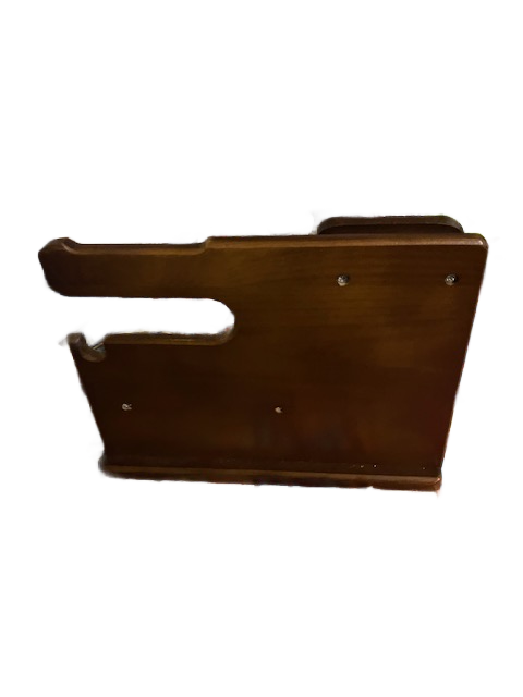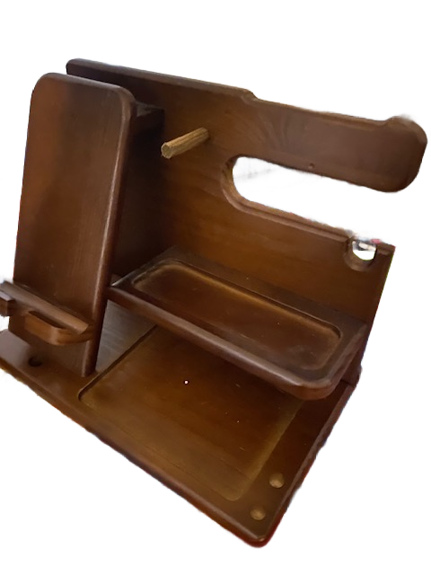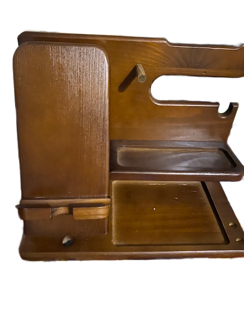 This vintage wooden desk organiser is a solid, well-made piece, designed to sit comfortably on a desk or workspace. Its distinctive upright form was originally intended to hold a telephone handset, with space below for notes, messages, or items needing to be kept close at hand.