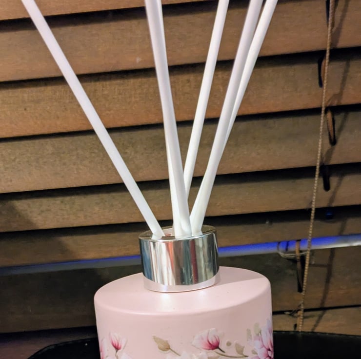 One empty pink glass diffuser bottle with white reed sticks decorated using floral transfers. This bottle can hold 150 ml of liquid..