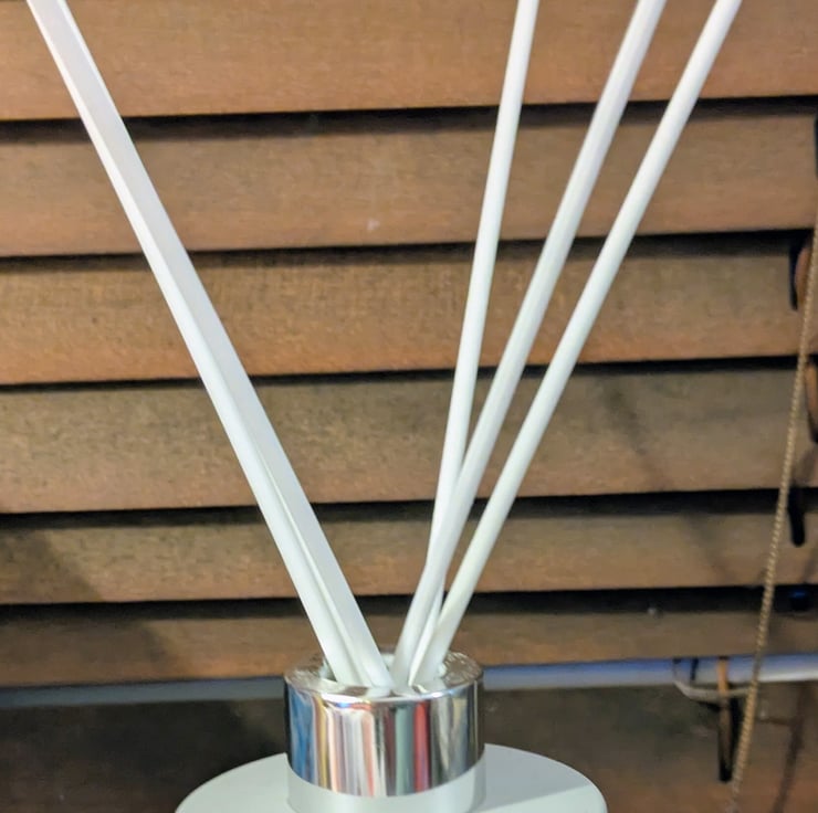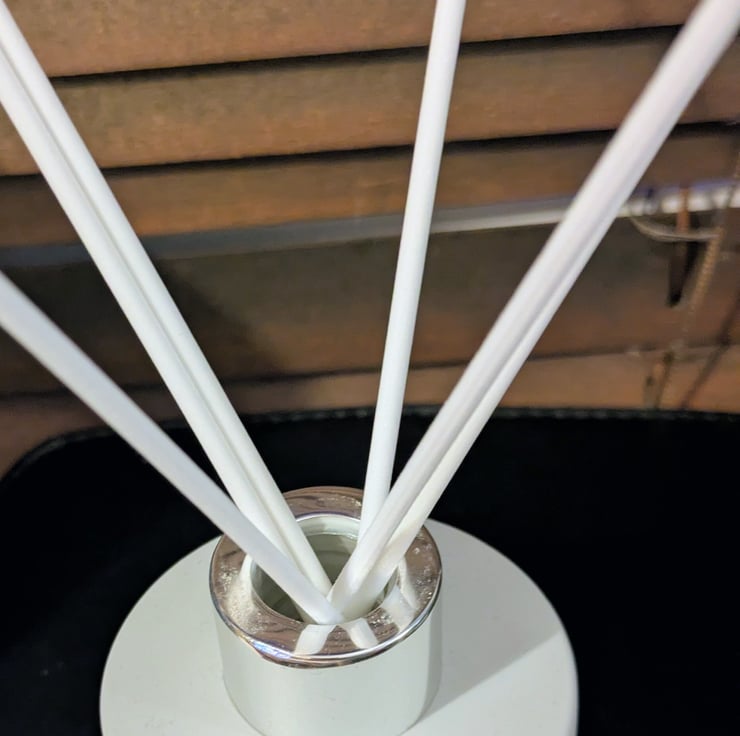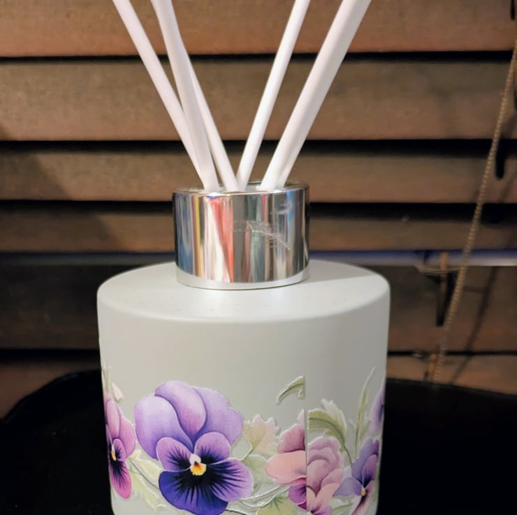 One empty grey glass diffuser bottle hand decorated with beautiful pansy flowers transfers the entire way around. Can hold upto 150 ml of liquid.
