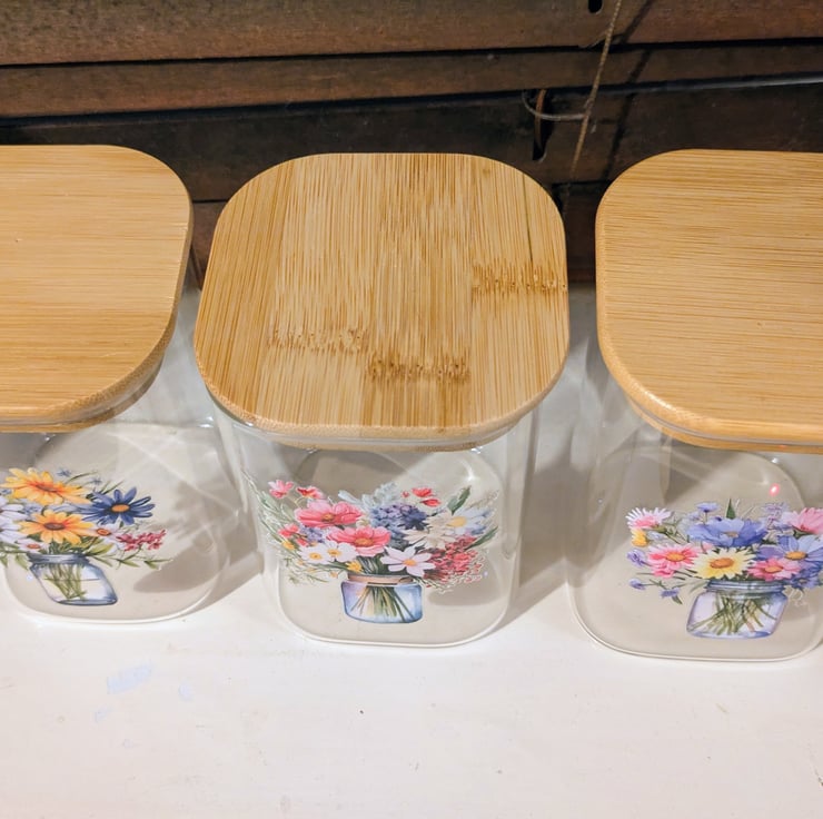 Three square glass storage jars with airtight bamboo lids. Each jar is decorated with a beautiful wildflower in jar theme transfer.