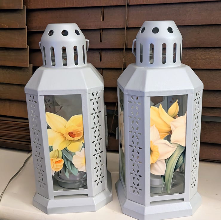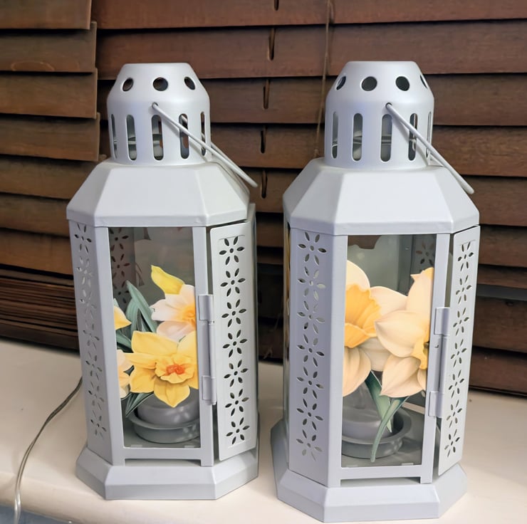 Set of two grey 22 cm metal lanterns each decorated on all four sides with a beautiful daffodils theme transfers. Comes with a led tea light candle.