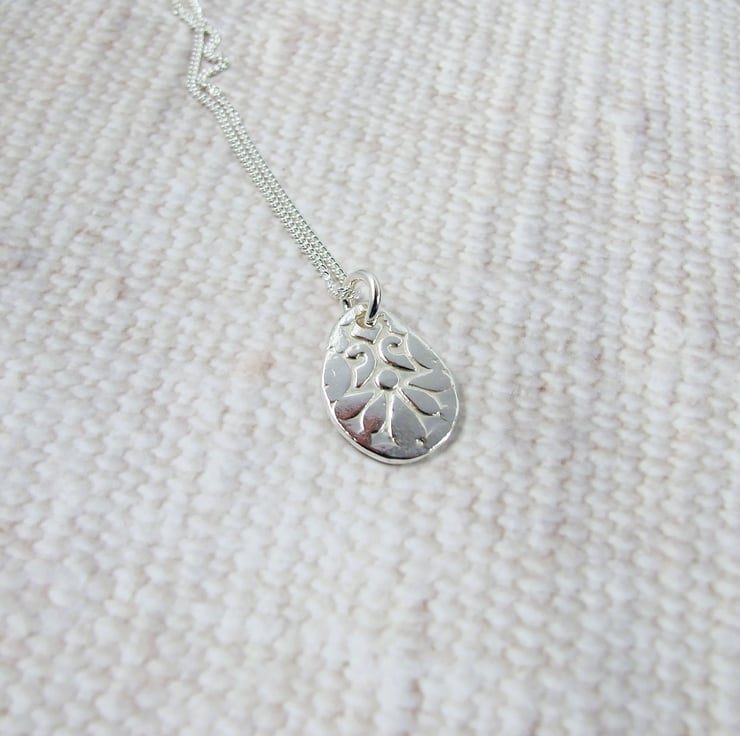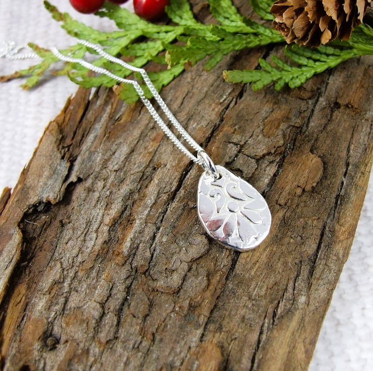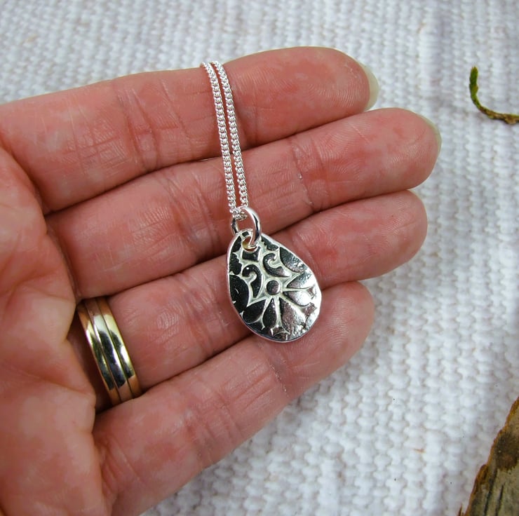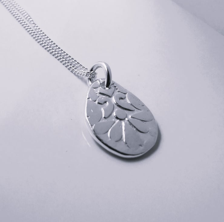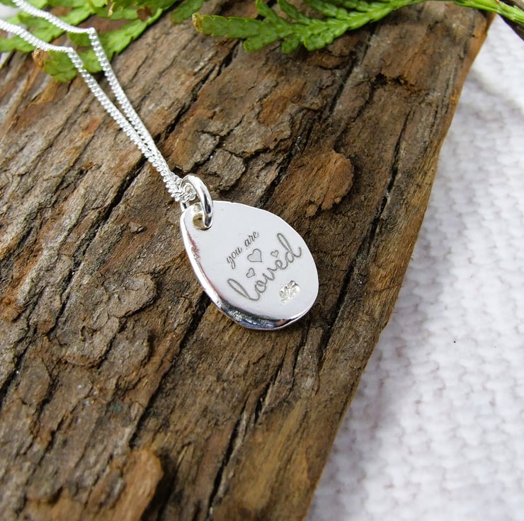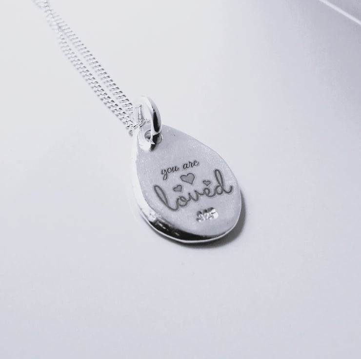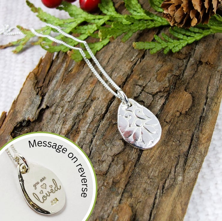 I have made the pebble shape by heating silver to melting point where it forms a natural pebble shape. Once cooled I have forged to flatten and shape into an organic teardrop. I then embossed the flower pattern using a steel plate. On the reverse I have added a message' you are loved' along with lots of little hearts. I created the message on artists digital software and then engraved with a laser tool. Fitted to an 18 inch .925 Sterling Silver Chain.