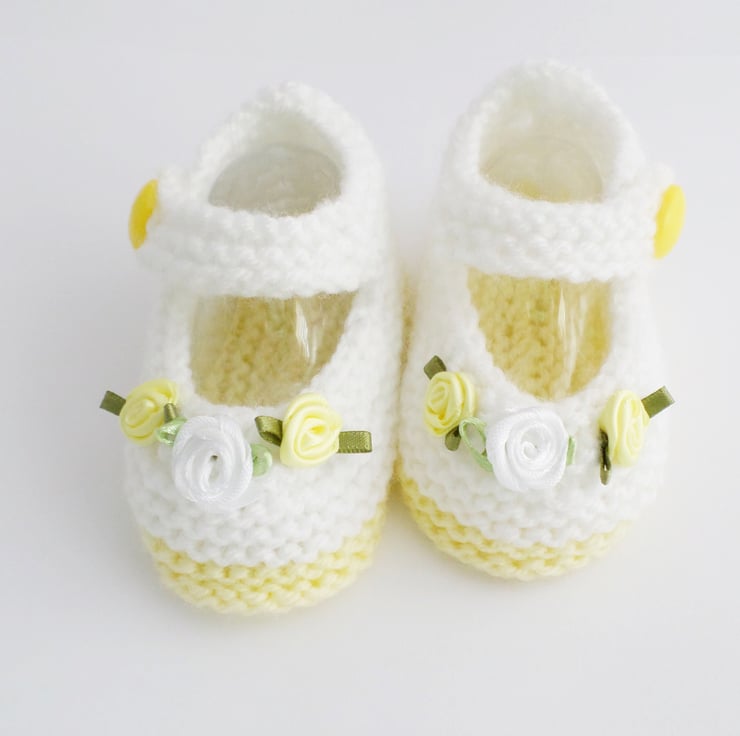 Hand knitted baby girl white and lemon booties in a Mary Jane shoe style with lemon button fastening and satin ribbon roses in 2 sizes