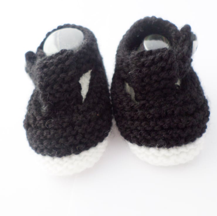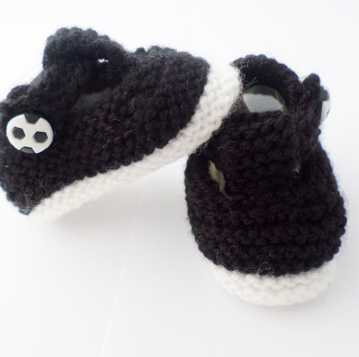 Hand knitted baby boy black booties in a T bar shoe style with football button fastening and white contrast sole in 2 sizes