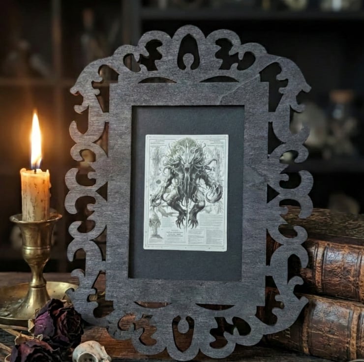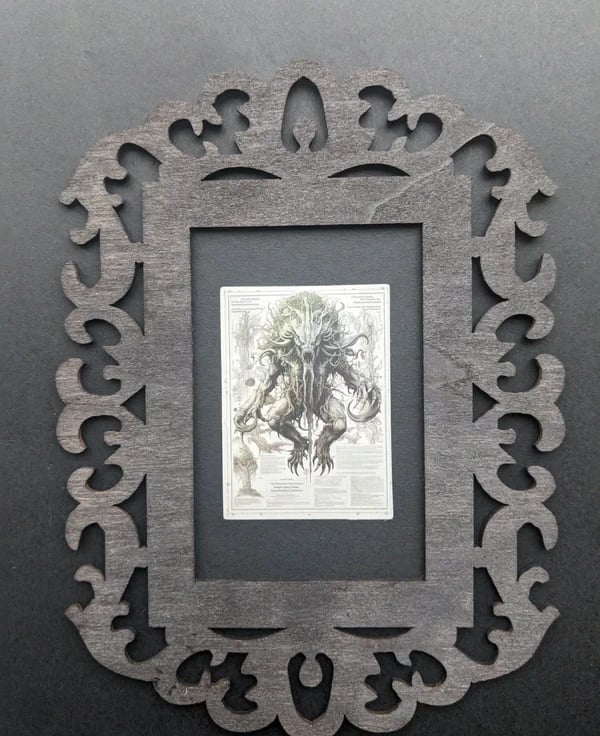 Inspired by cosmic horror and ancient bestiaries, this piece is perfect for adding a touch of dark fantasy to a desk, shelf, or gallery wall. The organic, swirling motifs of the frame perfectly mirror the tentacles and textures of the artwork within.