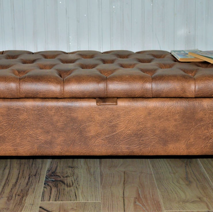 Add a touch of elegance and style with this stunning storage ottoman Chesterfield Design Deep Button Footstool. The footstool is expertly crafted with premium tan faux leather that will easily complement your existing home decor. The footstool is not only a great addition to your home, but it also comes with a 1-year manufacturer warranty for added peace of mind. Measuring 100cm in length, 58cm in width and 40cm in height, this footstool is perfect for use in any room of your home, including the conservatory, children's playroom, porch, kitchen, bedroom, living room, home office/study, children's bedroom, patio, hallway, dining room, and utility/laundry room. With a weight of 20kg, it is also easy to move around as needed.