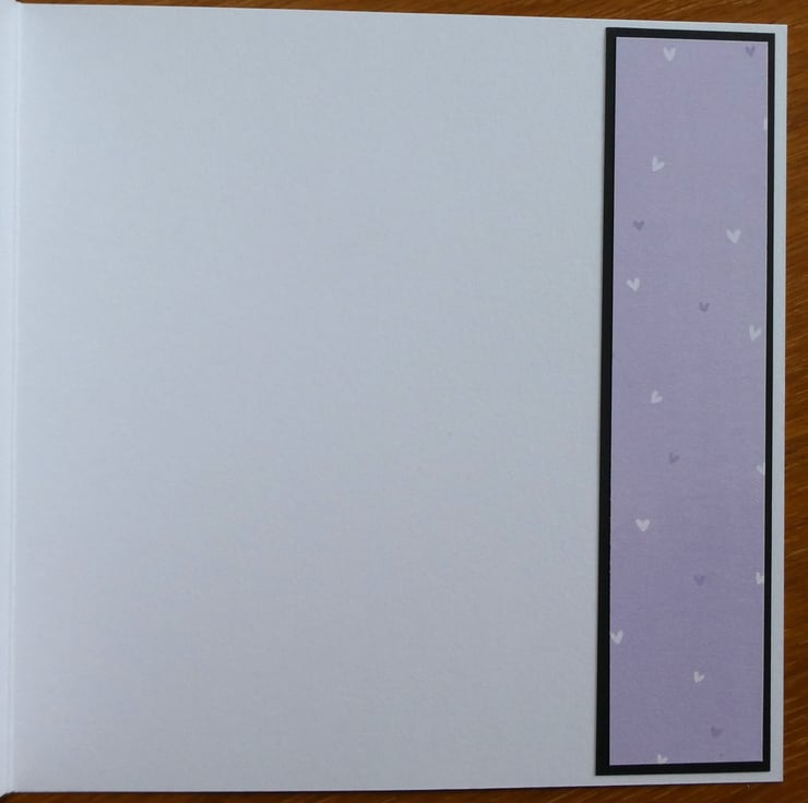 The design has been finished with a frame of black card and mounted onto a white card measuring 14.8cm square. Inside the right hand edge of the card is a strip of lilac and white heart patterned paper with a black card frame.