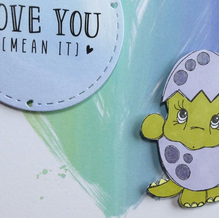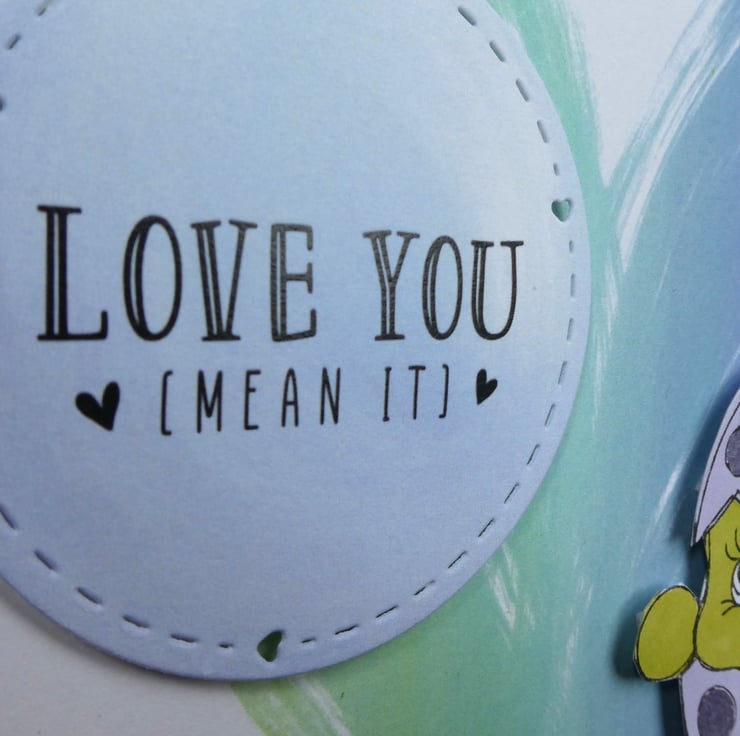 A circular die cut message with the words Love You (mean it) on a pale blue and white background has been added on the left hand side.