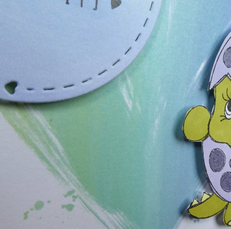 It features a cute dinosaur standing inside an eggshell, which has been hand stamped, inked in shades of lilac, purple, lime and moss green and carefully cut.