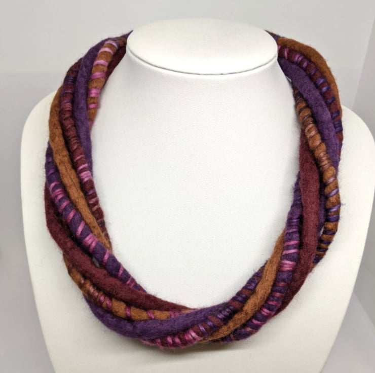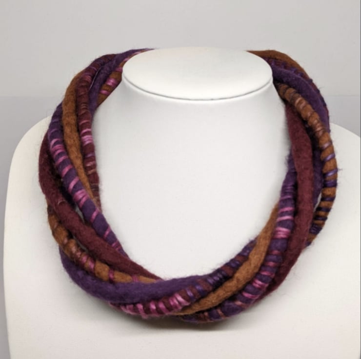 This handmade wet felted necklace twists together felted cords of soft merino wool in shades of deep maroon, purple and rust, wrapped with a toning lustrous merino and silk blend yarn. It closes with a strong magnetic fastening.