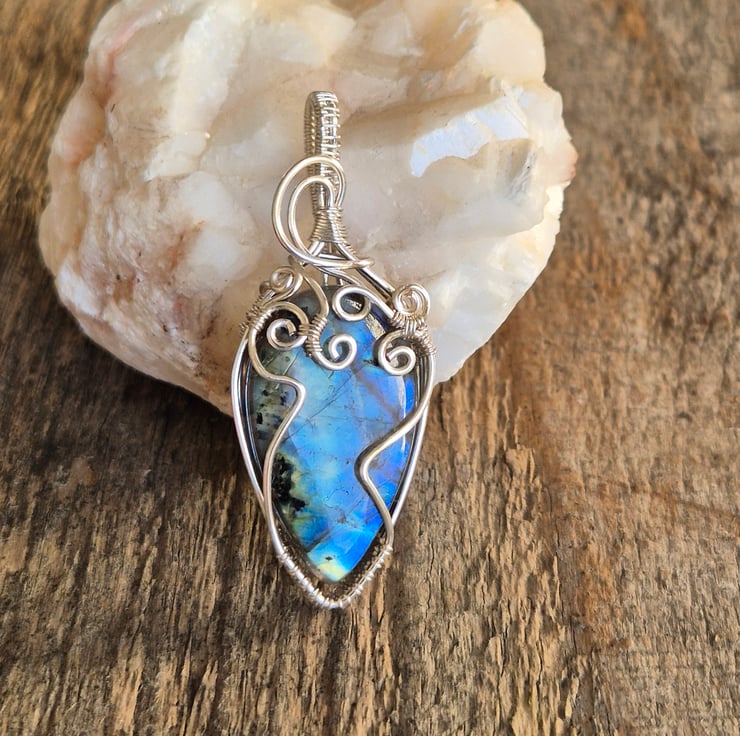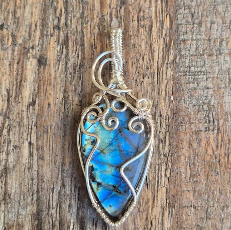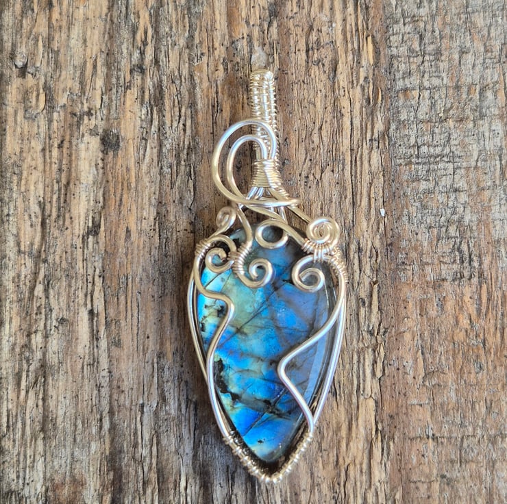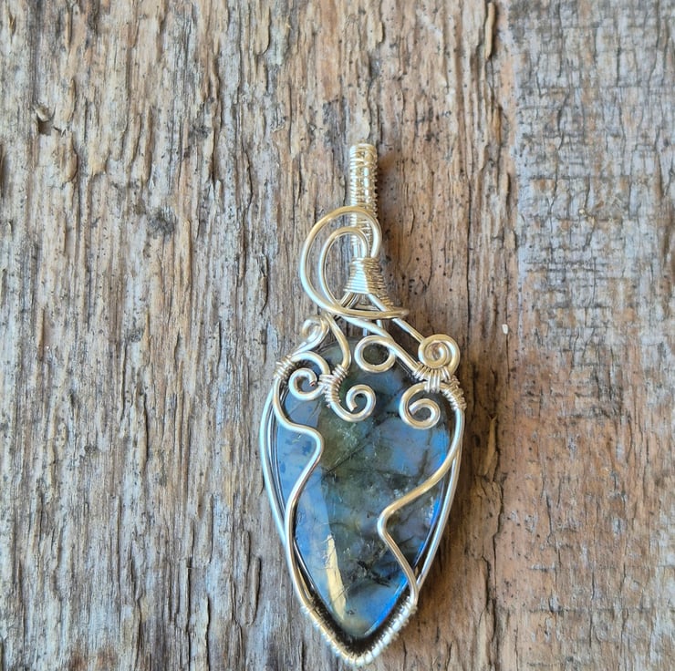 A handcrafted silver plated wire wrap, featuring a natural labradorite with vivid blue flash, elegant scroll work secures the stone in a one of a kind design.