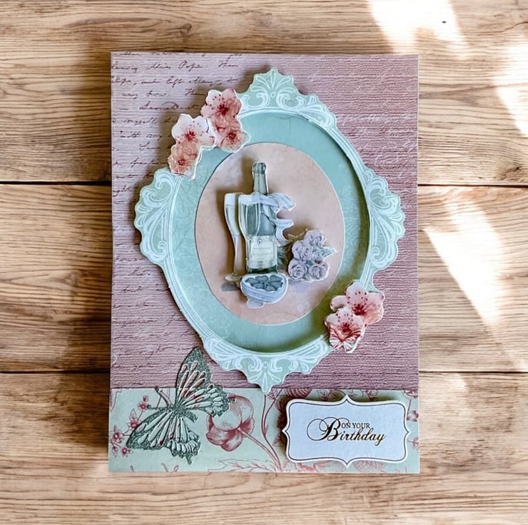 The card features a soft background of pale pinks and mauve tones, layered with delicate letters and floral details. A stunning 3D decoupage scene takes centre stage, showcasing champagne and glasses surrounded by flowers, heart-shaped sweets, and graceful butterflies. The raised “For Your Birthday” wording adds extra depth and dimension, while a silver butterfly provides a refined finishing touch.